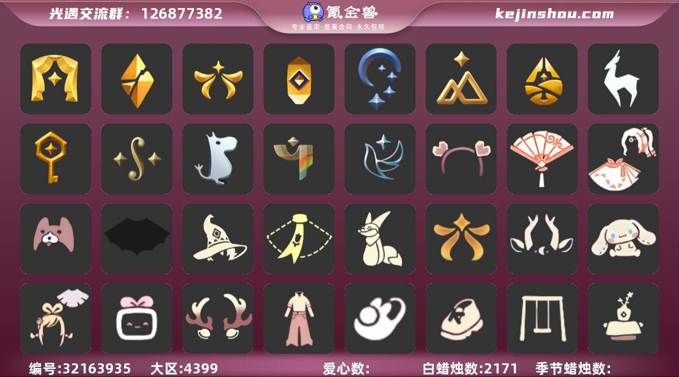 安卓官服 邮箱账号 3珍稀物品 14毕业季 2毕业图 2171蜡烛 【珍稀物品】白枭(帝企鹅发),透明蝶翼斗,彩虹围巾(五塑彩带斗) 【季节已毕业】迁徙季,青鸟季,表演季,破晓季,欧若拉季(欧若拉),追忆季,夜行季,拾光季,归巢季,九色鹿(九色鹿季),筑巢季,二重奏季,姆明季,彩染季 【完成地图】霞谷,墓土(暮土) 【礼包】青衫落拓礼包,线框斗篷礼包(周年线框斗篷),牛仔裤(阔腿牛仔),兔子鞋(兔子拖鞋),运动鞋(跃动跑鞋),火焰眼镜,爱心眼镜,蝴蝶结(大蝴蝶结),姆明饰品套装(姆明尾巴),海蓝波浪发型(海洋发型),彩虹帽(多彩绒帽),南瓜(冥龙南瓜),巫师(巫师帽),绊爱(绊爱斗篷)(绊爱礼包),橘子(大橘大利),奥利奥(周年庆抱枕),雪花(雪花发夹),贝壳(贝壳发饰),兔子(玉兔头饰)(玉兔发饰)(兔子发饰),心心相印发饰礼包,四叶草(四叶草头饰),星月头饰(星月头冠),九色鹿角(神鹿祝福头饰)(神鹿祝福礼包),新年耳钉(金鳞耳饰),彩虹耳钉(彩虹耳饰),彩虹耳机,日光耳环,满月耳坠,枯角(巫树犄角),鹿角(圣诞鹿角),创始人(创始人斗篷),围巾(小王子斗篷)(小王子围巾),欧若拉之翼,福娃(福娃礼包)(春之日礼包)(铜钱斗),蝙蝠套(蝙蝠斗篷)(南瓜头),瑞雪(瑞雪斗篷)(暖冬瑞雪),白绒金(白雪斗篷),衔福献瑞礼包(衔福献瑞斗篷),吉他(音韵吉他)(白吉他),红伞(瑞气纸伞),献瑞折扇礼包,秋千(情人秋千),茶桌(花憩茶桌),小狐狸(狐狸背包),大耳狗抱枕,大铁头,小狗周年发饰(小狗周年头饰) 【裤子】筑巢季·裤子(设计师长袍),青鸟尊贵蓬头裤子(蓝色燕尾服),飞天裤(柔缎花边连)(九色鹿丝带裤),妮妮裙子(妮妮长裙),蓝绿裤(高领舞服),武士裤,背带裤,搓澡巾 【面具】夜行毕业面具(棕熊面具),黄眉企鹅面具,辉光羚羊面具 【面饰】黑框眼镜(粗框眼镜),青鸟毕业面饰(青鸟面饰),红耳机 【项链】围巾(肩带) 【发型】单侧绑发(单边小辫),海蓝波浪发型,飞天盘发(九色鹿丸子头),留辫蘑菇头...