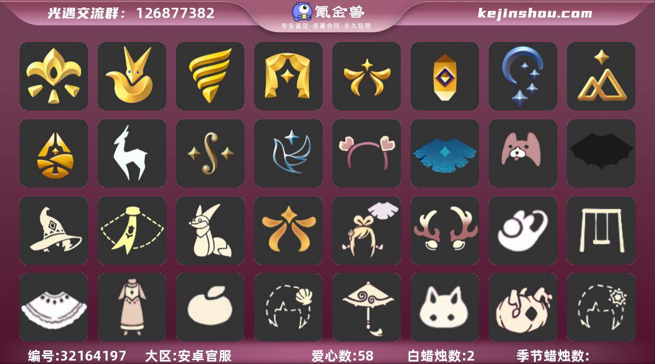 账号类型: 手机账号 季节已毕业: 小王子季,潜海季,表演季,欧若拉季,集结季,夜行季,追忆季,拾光季,归巢季,九色鹿季,二重奏季,青鸟季 完成地图: 晨岛,云野,雨林,霞谷,暮土,禁阁 珍稀物品: 白枭,透明蝶翼斗,玫瑰花,彩虹围巾 礼包: 蝙蝠套,巫师,围巾,小狐狸,欧若拉之翼,绊爱,鹿角,兔子鞋,秋千,白绒金,致爱装扮,橘子,贝壳,红伞,兔子,南瓜,雪花,星月头饰,新年裤,蝴蝶结,奥利奥,四叶草,小提琴,新年耳钉,创始人,遥鲲披肩斗篷,心心相印发饰礼包,小狗周年发饰,线框斗篷礼包 裤子: 武士裤,背带裤,搓澡巾,王子服,蓝绿裤,飞天裤,青鸟尊贵蓬头裤子 面具: 贴花面具,呼吸面具,夜行毕业面具,黄眉企鹅面具 面饰: 红耳机,黑框眼镜,青鸟毕业面饰 项链: 围巾 发型: 归巢毕业发型,若笠,虚荣,单侧绑发,小王子发型,留辫蘑菇头,飞天盘发 头饰: 行军锅头盔,羽毛发饰,牛仔帽,蓝色音乐会,平顶帽 斗篷: 绿芽,粉红绒毛斗篷,黄色连帽披风,燕尾斗篷,青鸟毕业斗篷 配饰: 雨伞,高音钢琴,相机,玫瑰花,二重奏挂画,鲲灯 亮点: 【优质装备】:表演季,白枭(帝企鹅发),武士裤,小王子季(王子季),潜海季,透明蝶翼斗,欧若拉季(欧若拉),归巢毕业发型(五塑彩羽发),行军锅头盔(六边锅帽子)(双耳锅帽子),羽毛发饰(多羽发饰),高音钢琴(白色高脚钢琴),集结季,玫瑰花,夜行季,追忆季,牛仔帽(西部帽),相机(季卡相机),拾光季,彩虹围巾(五塑彩带斗),归巢季,九色鹿(九色鹿季),王子服(小王子套装),蓝绿裤(高领舞服),飞天裤(柔缎花边连)(九色鹿丝带裤),围巾(肩带),蝙蝠套(蝙蝠斗篷)(南瓜头),欧若拉之翼,绊爱(绊爱斗篷)(绊爱礼包),红耳机,围巾(小王子斗篷)(小王子围巾),鹿角(圣诞鹿角),巫师(巫师帽),小狐狸(狐狸背包),晨岛,云野,雨林,霞谷,墓土(暮土),禁阁,若笠(箬笠),青鸟尊贵蓬头裤子(蓝色燕尾服),二重奏季,二重奏挂画(合奏挂画),贴花面具(丛林黑面具),呼吸面具(潜水面具),夜...