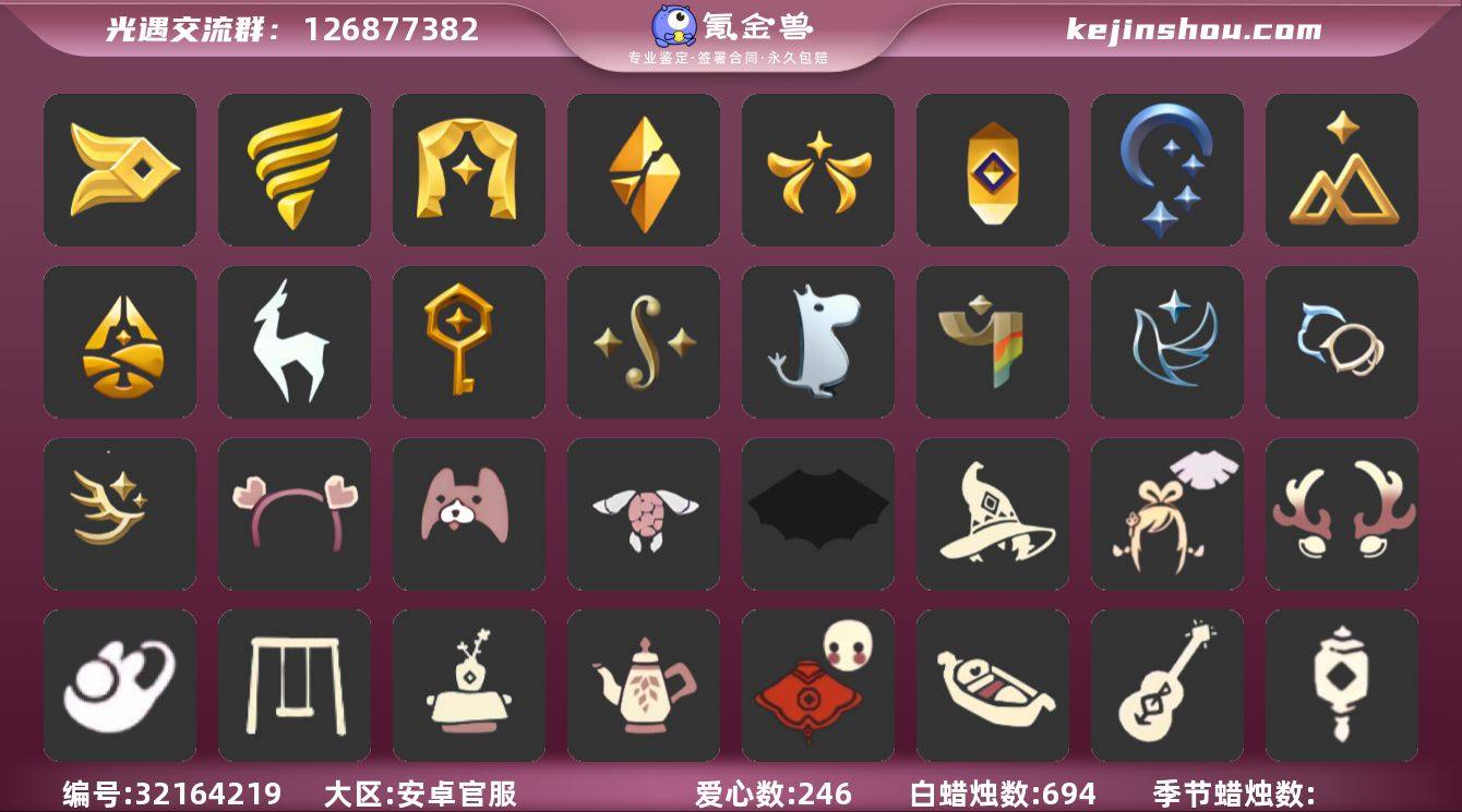账号类型: 邮箱账号 季节已毕业: 风行季,潜海季,表演季,破晓季,欧若拉季,夜行季,追忆季,拾光季,归巢季,九色鹿季,筑巢季,二重奏季,姆明季,彩染季,青鸟季,双星季,迁徙季 完成地图: 晨岛,云野,雨林,霞谷,暮土,禁阁 珍稀物品: 白枭,透明蝶翼斗,彩虹围巾 礼包: 蝙蝠套,巫师,绊爱,鹿角,兔子鞋,秋千,茶桌,茶壶,福娃,小船,吉他,灯笼,橘子,贝壳,黄伞,兔子,南瓜,枯角,雪花,水母,猫套,猫背饰,四叶草,新年耳钉,创始人,日光耳环,海龟斗篷,心心相印发饰礼包,小狗周年发饰 裤子: 武士裤,背带裤,搓澡巾,击剑裤,妮妮裙子,蓝绿裤,飞天裤,筑巢季·裤子,青鸟尊贵蓬头裤子 面具: 呼吸面具,夜行毕业面具,黄眉企鹅面具,辉光羚羊面具 面饰: 红耳机,黑框眼镜,青鸟毕业面饰 项链: 围巾 发型: 归巢毕业发型,若笠,虚荣,单侧绑发,留辫蘑菇头,飞天盘发 头饰: 羽毛发饰,牛仔帽,蓝色音乐会,平顶帽 斗篷: 海洋斗,绿芽,粉红绒毛斗篷,遥鲲斗篷,燕尾斗篷,冥龙斗篷,彩染围巾斗篷,青鸟毕业斗篷 配饰: 雨伞,筑巢季·小手办,高音钢琴,姆明抱枕,小红伞,相机,二重奏挂画,鲲灯 亮点: 【优质装备】:表演季,白枭(帝企鹅发),武士裤,风行季,潜海季,破晓季,透明蝶翼斗,欧若拉季(欧若拉),归巢毕业发型(五塑彩羽发),羽毛发饰(多羽发...