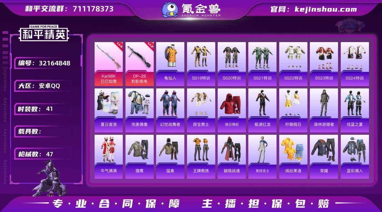 无二次-安卓 手Q-0粉装-2特效枪-0载具-0粉色飞行器-11802热力值-2王牌印记-41套装-47枪皮 【热门品类】:套装-龟仙人 【粉色枪皮等级】:Kar98K-巳巳如意(四级),DP-28-豹影疾电(二级) 【粉色枪皮】:Kar98K-巳巳如意,DP-28-豹影疾电 【稀有套装】:套装-龟仙人 【稀有枪皮】:AKM-彩虹符号,AKM-灼热熔岩,AKM-破晓战魂,M16A4-幻世战舞者,SCAR-L-炫彩节奏,SCAR-L-玉兔迎春,SCAR-L-红色方程式,M416-糯团青竹,M416-红色方程式,M416-绯红前夜,M416-蓝色火焰,GROZA-彩虹符号,AUG-耀粉歌者,M762-天降萌叽,G36C-星穹咏叹调,AC-VAL-天降萌叽,蜜獾-天降萌叽,UZI-天降萌叽,UMP45-生命誓言,Kar98K-影袭,Kar98K-炫彩节奏,M24-影袭,AWM-垂柳戏鸭,AWM-飒粉甜心,VSS-彩虹符号,QBU-飒粉甜心,S686-生命誓言,S1897-炫彩节奏,S12K-音爆索尼克,S12K-幻世战舞者,DBS-彩虹符号,DP-28-彩虹符号,MG3-幻世战舞者,短管霰弹-星穹咏叹调 【其他套装】:套装-SS19特训,套装-SS20特训,套装-SS21特训,套装-SS22特训,套装-SS23特训,套装-SS24特训,套装-夏日音浪,套装-完美偶像,套装-幻世战舞者,套装-探宝勇士,套装-旭日情侣,套装-极速红龙,套装-柠萌假日,套装-森林游猎者,套装-炫蓝之夏,套装-牛气满满,套装-猎鹰,套装-猛禽,套装-王牌教练,套装-破晓战魂,套装-竞技名士,套装-缤纷果语,套装-荣耀,套装-蓝彩潮人,套装-蓝色运动,套装-野性战心,套装-长空猛禽,套装-魅力单车,套装-麻辣教官,套装-黄色名流,套装-黑色伏地魔,套装-龟仙人,套装-漫步者,套装-荧惑魅影 【稀有背包】:百万伏特背包(1级) 【营地ID】:928038420
