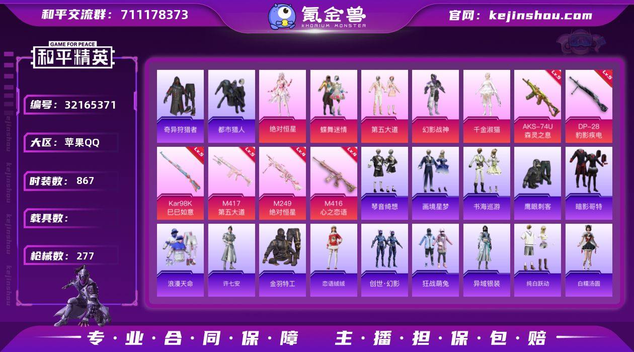 【特价出售】苹果Q-4稀有5粉装11特效枪15热门221套装277枪皮 84470热力值 13印记 历史传奇王牌16星 【4稀有】 奇异狩猎者 AKM-缤纷海域 都市猎人 浪漫天命 【5粉装】 蝶舞迷情 千金淑猫 幻影战神 绝对恒星 第五大道 【11特效枪】 M416-心之恋语 (4级) AKS-74U-森灵之息 (5级) Kar98K-巳巳如意 (5级) DP-28-豹影疾电 (5级) M417-第五大道 (5级) M249-绝对恒星 (4级) 信号枪-金乌曜日 (2级) AKS-74U-森灵之息 (5级) Mk14-福马献瑞 (5级) AA12-G-萌骑幻想 (1级) ACE32-萌骑漫游 (2级) 【15热门】 龟仙人 暗夜之虎 浪漫假日 晶辉守护 鹰眼刺客 暗夜之虎 金羽特工 暗影哥特 团圆交子 瑞龙福将 忍者信条 漫步者 破蛋小黄鸡 极速红龙 M762-瑞龙福将 【2头盔】 幻影战神头盔 深海小丑鱼头盔 【1背包】 幻影战神背包