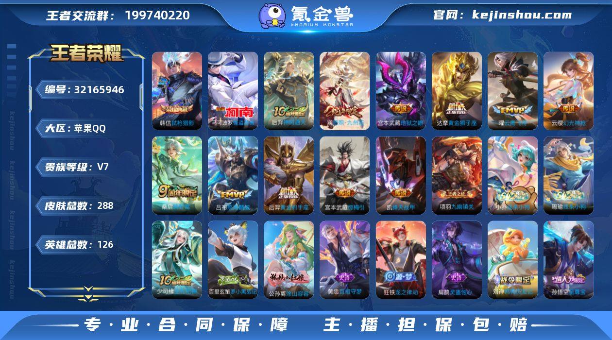 【Hwz759】【精品男号】苹果Q-可二次-V7-市标橘右京-10县标-9按键-256花花-126英雄-288皮肤-1典藏皮肤-1珍品传说-11传说-82史诗(弑枪猎影、至尊宝) 【英雄全皮】:孙权全皮,敖隐全皮,影全皮 【荣耀典藏】:韩信弑枪猎影 【珍品传说】:马可波罗怪盗基德 【传说皮肤】:后羿神树通天,澜愿照九州拓,云缨幻光神枪,桑启鸣野蒿,宫本武藏惊梅引,吕布怒海麟威,铠绛天战甲,曜云鹰飞将,达摩黄金狮子座,后羿黄金射手座,宫本武藏地狱之眼 【限定皮肤】:蒙犽顽岩魄,蔡文姬夏日便利店,大乔绒语心约,虞姬夏日便利店,姜子牙天穹之誓,杨戬破阵退雄兵,狄仁杰阴阳师,赵云皇家上将,墨子神迹守卫,孙尚香蔷薇恋人,高渐离玩趣恶龙,钟无艳超时空战士,白起夜都怪侠,元歌无心,甄姬落雪兰心,狄仁杰魔术师,狄仁杰万华元夜,达摩沙漠行僧,项羽海滩派对,老夫子醍醐杖,老夫子航海奇遇记,程咬金演武夺筹,王昭君午后时光,兰陵王金庭之子,孙悟空美猴王,孙悟空至尊宝,孙悟空孙行者,后羿圣弓游侠,李元芳云中旅人,钟馗驱傩正仪,鬼谷子原初探秘者,鬼谷子五谷丰年,黄忠火炮绅士,苏烈千军破阵,百里玄策原初追逐者,沈梦溪大漠名商,裴擒虎李小龙,裴擒虎擒涛扼浪,狂铁电玩高手,云中君纤云弄巧,上官婉儿梁祝,嫦娥暖冬兔眠,西施玲珑珍味,鲁班大师探海日志,桑启海盐诗旅,暃星界游侠,戈娅驭风魔法,艾琳女武神,司空震地狱燃心,张良古海寻踪,高渐离燃音魔法,妲己灵卜魔法,鬼谷子天穹祈灯,沈梦溪龙舞盛年,刘邦剑破天穹,程咬金群星魔术团,镜青焰无极,项羽苍威无极,周瑜熔金海岸 【年限皮肤】:孙悟空美猴王,澜愿照九州拓 【赛季限定】:老夫子醍醐杖,鬼谷子原初探秘者,狄仁杰万华元夜,程咬金演武夺筹,钟馗驱傩正仪,苏烈千军破阵,达摩沙漠行僧,兰陵王金庭之子,沈梦溪大漠名商,李元...