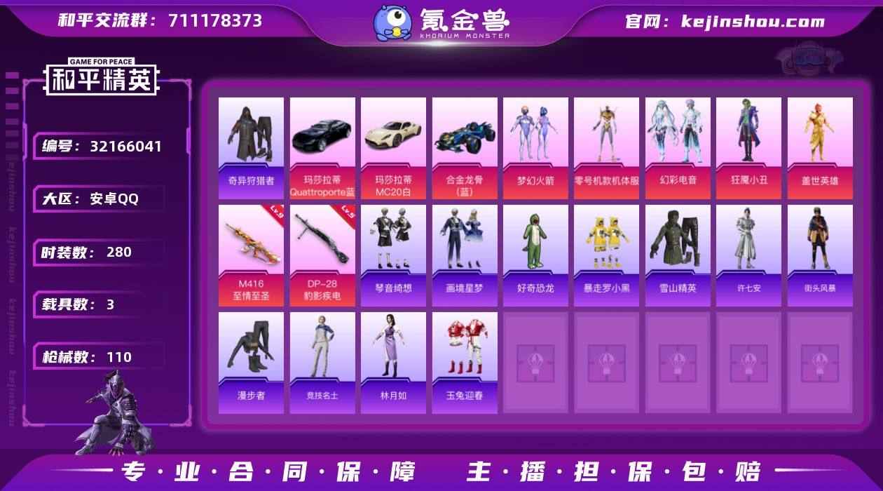 【特价出售】安卓Q-1稀有3载具5粉装2特效枪9热门71套装110枪皮 35684热力值 3印记 历史卓越王牌17星 【1稀有】 奇异狩猎者 【3载具】 玛莎拉蒂M白色 玛莎拉蒂Q蓝色 合金龙骨蓝色 【5粉装】 黄螳螂 梦幻火箭 盖世英雄 狂魇小丑 幻彩电音 【2特效枪】 DP-28-豹影疾电 (5级) M416-至情至圣 (9级) 【9热门】 龟仙人 雪山精英 好奇恐龙 暴走罗小黑 暗夜契约 纯白誓言 漫步者 破蛋小黄鸡 M416-仓鼠灰灰 【1飞行器】 梦幻火箭飞行器 【2背包】 梦幻火箭背包 罗小黑背包