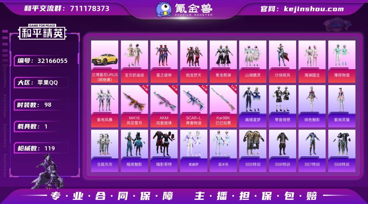 无二次-苹果-和平一体号附赠王者手Q-9粉装-5特效枪-1载具-3粉色飞行器-4王牌印记-98套装-119枪皮苹果-最强王者段位-128英雄-256皮肤-1典藏皮肤-13传说-70史诗HZ2638013 【热门品类】:套装-暗影哥特 【粉色套装】:粉装-宝贝奶油派,粉装-星之彼岸,粉装-焰龙焚天,粉装-骨龙祭渊,粉装-山涧鹿灵,粉装-沙场疾风,粉装-海渊国主,粉装-薄荷物语,粉装-紫电风暴 【粉色枪皮等级】:AKM-炫紫旋律(五级),SCAR-L-青春物语(五级),M416-风花雪月(六级),Kar98K-巳巳如意(四级),Mk14-福马献瑞(四级) 【粉色载具】:兰博基尼URUS(明艳黄) 【粉色枪皮】:AKM-炫紫旋律,SCAR-L-青春物语,M416-风花雪月,Kar98K-巳巳如意,Mk14-福马献瑞 【英雄全皮】:敖隐全皮,夏洛特全皮,影全皮 【荣耀典藏】:诸葛亮星域神启 【传说皮肤】:后羿神树通天,桑启鸣野蒿,露娜霜月吟,夏洛特浮生妄,曜山海苍雷引,虞姬启明星使,干将莫邪久胜战神,达摩黄金狮子座,百里玄策白虎志,诸葛亮武陵仙君,李白凤求凰,孙尚香末日机甲,狄仁杰超时空战士 【粉色飞行器】:炫彩糖果飞行器,齐天大圣飞行器,庄周梦蝶飞行器 【粉色降落伞】:甜心宝贝降落伞,星之彼岸降落伞,暗夜玫瑰降落伞,林间仙鹿降落伞,洛神天依降落伞,风花雪月降落伞,青春物语降落伞,橘柚倾心降落伞,环太平洋降落伞,千金淑猫降落伞,无垠阁降落伞,异瞳寒姬降落伞,炫彩糖果降落伞 【稀有套装】:套装-雪国风尚,套装-炫彩糖果,套装-马上有钱,套装-紫幽梦,套装-蓝冰羽,角色-绯色魅影,角色-紫俏灵猫,套装-画境星梦,套装-琴音绮想,套装-红釉青花,角色-霜纹水星 【稀有枪皮】:AUG-冰晶雪宝,AKM-恐龙拽拽,AKM-星之彼岸,AKM-虎虎生威,M16A4-千金淑猫,SCAR-L-暗夜玫瑰,M416-糯团青竹,M416-红色方程式,GROZA-异彩先驱,GROZA-恐龙拽拽,GROZA-蓝莓...