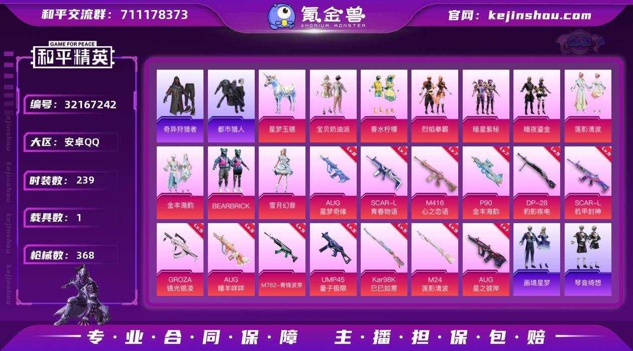 安卓 手Q-10粉装-16特效枪-1载具-3粉色飞行器-124672热力值-14王牌印记-239套装-368枪皮 【热门品类】:套装-浪漫天命,套装-都市猎人,套装-小丑鱼,套装-奇异狩猎者,角色-军刀雅典娜,套装-忍者信条,套装-粉红小猪,角色-8号机,角色-Mark.06 【粉色套装】:粉装-宝贝奶油派,粉装-香水柠檬,粉装-烈焰拳霸,粉装-暗星紫秘,粉装-暗夜鎏金,粉装-莲影清波,粉装-金丰海韵,粉装-BEARBRICK,粉装-雪月幻音,角色-罪夜之冕 【粉色枪皮等级】:SCAR-L-机甲封神(五级),SCAR-L-青春物语(七级),M416-心之恋语(七级),GROZA-镜光银凌(五级),AUG-星之彼岸(一级),AUG-星梦奇缘(八级),AUG-暖羊咩咩(五级),M762-青锋波束(五级),UMP45-量子极限(五级),AKS-74U-森灵之息(四级),P90-金丰海韵(七级),Kar98K-巳巳如意(五级),M24-莲影清波(五级),Mk14-福马献瑞(五级),DP-28-豹影疾电(五级),燃烧瓶-天降桃花(五级) 【粉色载具】:星梦玉骢 【粉色枪皮】:SCAR-L-机甲封神,SCAR-L-青春物语,M416-心之恋语,GROZA-镜光银凌,AUG-星之彼岸,AUG-星梦奇缘,AUG-暖羊咩咩,M762-青锋波束,UMP45-量子极限,AKS-74U-森灵之息,P90-金丰海韵,Kar98K-巳巳如意,M24-莲影清波,Mk14-福马献瑞,DP-28-豹影疾电,燃烧瓶-天降桃花 【粉色飞行器】:炫彩糖果飞行器,星梦奇缘飞行器,BEARBRICK飞行器 【粉色降落伞】:绝对恒星降落伞,快乐主宰降落伞,百万伏特降落伞,繁花小夜曲降落伞,甜蜜誓约降落伞,四圣焕新降落伞,潮汐统领降落伞,锦绣火鲤降落伞,香水柠檬降落伞,洛神天依降落伞,蓝莓炮弹降落伞,暗星紫秘降落伞,筑梦精灵降落伞,炙焰牛王降落伞,闪光银龙降落伞,环太平洋降落伞,暖熊萌萌降落伞,旋转彩虹降落伞,暗夜鎏金降落伞,第五大道降落伞,仲夏莫吉托降落伞,莲影清波降落伞,圣堂之誓降落伞,精灵梦...