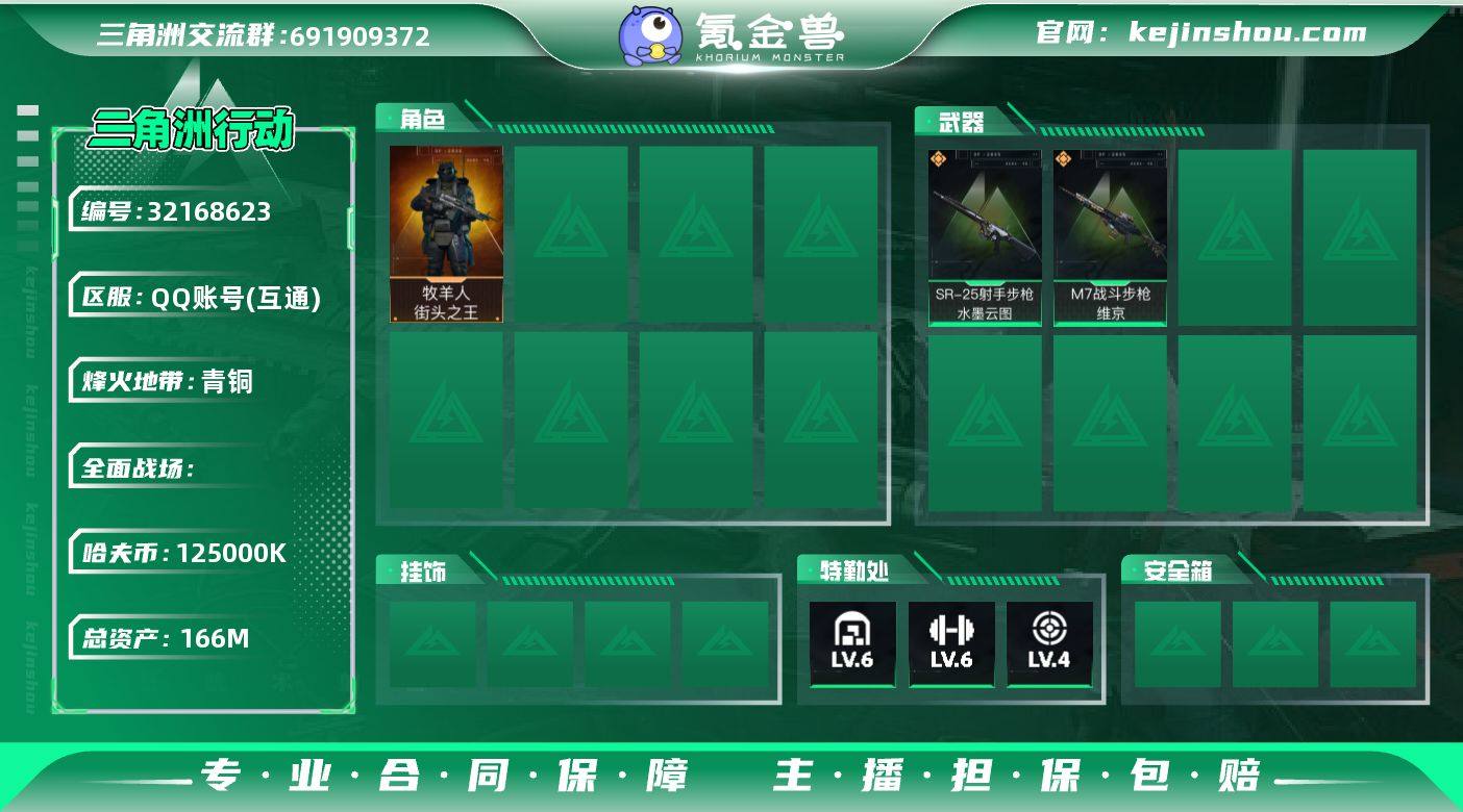 XX472 总资产:166000000 干员外观: 牧羊人-街头之王(S2) 近战-黑鹰 传说武器皮肤: M7战斗步枪-维京 AS Val突击步枪-蛇年祥瑞 SR-25射手步枪-水墨云图 三端互通Q区实名:不可修改 仓库等级:6级 训练中心等级:6级 靶场等级:4级 哈夫币:125000000 烽火地带段位:青铜 实名人:不是本人 干员外观数:2 传说枪皮数:3