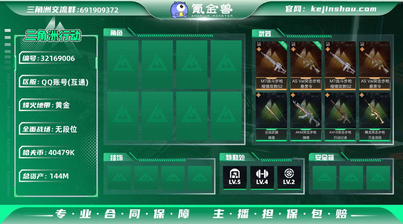 【sjz4546】144m总资产-40479k哈伏币-60烽火等级-黄金-1战场等级-无军衔 【近战皮肤】:近战-暗星,近战-黑鹰 【典藏外观】:M7战斗步枪-棱镜攻势S2,AS Val突击步枪-悬赏令 【典藏外观成色】:M7战斗步枪-棱镜攻势S2(优品B),AS Val突击步枪-悬赏令(优品C) 【传说外观】:AKM突击步枪-锦绣,K416突击步枪-行动记录,腾龙突击步枪-万金泪冠,K437突击步枪-锦绣,MK47突击步枪-暗星,SMG-45冲锋枪-锦绣,SR-3M紧凑突击步枪-暗星,勇士冲锋枪-万金泪冠,M14射手步枪-缄花,SKS射手步枪-骑士,SR-25射手步枪-缄花,AWM狙击步枪-万金泪冠,.357左轮-缄花 【史诗外观】:勇士冲锋枪-檀劫铳影,K416突击步枪-冬日风情,SG552突击步枪-深海恐惧,SG552突击步枪-哈夫克警备,腾龙突击步枪-猎鳄行动,MP7冲锋枪-六套之力,PKM通用机枪-阿萨拉特攻,SVD狙击步枪-阿萨拉工艺,M14射手步枪-工业狂潮, M14射手步枪-航天庆典,SV-98狙击步枪-囚徒,M700狙击步枪-竞技风 【稀有外观】:AKM突击步枪-青纹,M7战斗步枪-天际线,PKM通用机枪-极地勘察队,K437突击步枪-巨兽,K416突击步枪-一帆风顺,SG552突击步枪-2026,SG552突击步枪-贴花艺术, AK-12突击步枪-马年新春,SCAR-H战斗步枪-荣耀列队,MP5冲锋枪-弄臣,SMG-45冲锋枪-行动开启,SMG-45冲锋枪-幻影结构,勇士冲锋枪-冰天雪地,M1014霰弹枪-幻影结构,M249轻机枪-冰天雪地,QJB201轻机枪-哈夫克卫队,SKS射手步枪-弄臣,SR-25射手步枪-开拓 【普通外观】:AKS-74U突击步枪-监察,SCAR-H战斗步枪-旧工业,PTR-32突击步枪-噬菌体,M4A1突击步枪-高雅黑,M4A1突击步枪-海色,QBZ95-1突击步枪-海色,QBZ95-1突击步枪-2026,K416突击步枪-几何迷彩,K416突击步枪-高雅黑,SG552突击步枪-浅蓝涂装,SG552突击步枪-海浪,SCAR-H战斗步枪-数码迷彩,G3战斗步枪-高雅黑,PTR-32突...