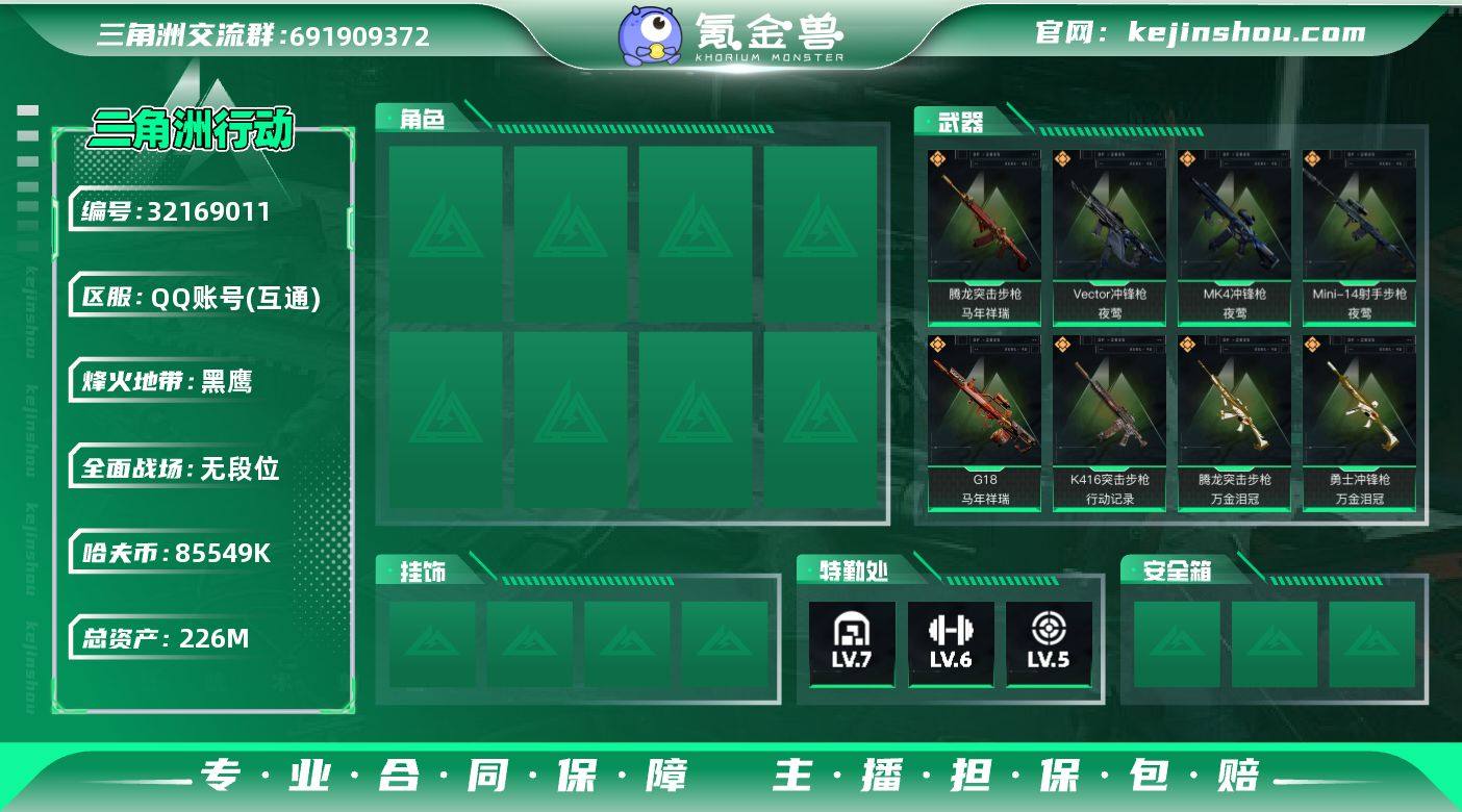 【sjz4720】226m总资产-85549k哈伏币-60烽火等级-黑鹰-1战场等级-无军衔 【近战皮肤】:近战-黑鹰 【传说外观】:K416突击步枪-行动记录,AUG突击步枪-悠然茶歇,腾龙突击步枪-马年祥瑞,腾龙突击步枪-万金泪冠,MK47突击步枪-悠然茶歇,Vector冲锋枪-夜莺,UZI冲锋枪-悠然茶歇,勇士冲锋枪-万金泪冠,MK4冲锋枪-夜莺,Mini-14射手步枪-夜莺,M14射手步枪-蛮荒,M14射手步枪-缄花,SR-25射手步枪-缄花,AWM狙击步枪-万金泪冠,.357左轮-缄花,G18-马年祥瑞 【史诗外观】:K416突击步枪-冬日风情,K416突击步枪-腊梅,K437突击步枪-丛影谍踪,MP5冲锋枪-竞技风,SMG-45冲锋枪-阿萨拉特攻,SR-3M紧凑突击步枪-开工大吉,勇士冲锋枪-丛影谍踪,MP7冲锋枪-六套之力,M249轻机枪-丛影谍踪,QJB201轻机枪-炽焰,VSS射手步枪-丛影谍踪,M14射手步枪-工业狂潮, M14射手步枪-航天庆典,SV-98狙击步枪-猎鳄行动 【稀有外观】:QJB201轻机枪-千里骏骨,AKM突击步枪-肃杀,K416突击步枪-一帆风顺,SG552突击步枪-2026,SG552突击步枪-马年新春,SG552突击步枪-贴花艺术, AK-12突击步枪-马年新春,SCAR-H战斗步枪-荣耀列队,G3战斗步枪-猛禽,CAR-15突击步枪-来财,KC17突击步枪-来财,MP5冲锋枪-弄臣,Vector冲锋枪-先锋,野牛冲锋枪-前沿科技,SMG-45冲锋枪-行动开启,SMG-45冲锋枪-幻影结构,SR-3M紧凑突击步枪-马年新春,M1014霰弹枪-幻影结构,M249轻机枪-冰天雪地,Mini-14射手步枪-来财,SKS射手步枪-弄臣,SR-25射手步枪-行动开启,SV-98狙击步枪-星链科技,SV-98狙击步枪-哈夫克航天,SV-98狙击步枪-精英联盟,QSZ92G-一帆风顺,G18-前沿科技,G18-星链科技,G18-哈夫克航天 【普通外观】:R93狙击步枪-斑马,M4A1突击步枪-粉色涂装,M4A1突击步枪-高雅黑,QBZ95-1突击步枪-海浪,QBZ95-1突击步枪-三角洲力量,QBZ95...