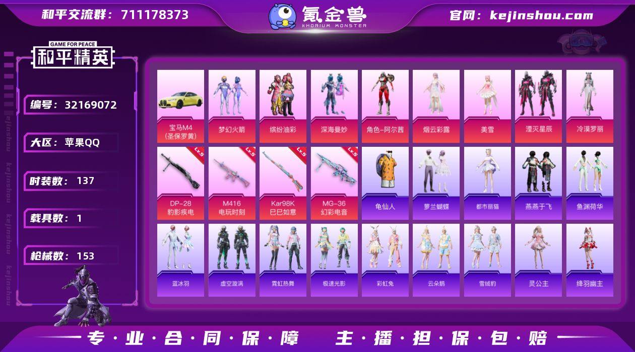苹果【素材号 梦幻火箭/缤纷油彩/M416-电玩时刻(五级)/宝马M4(圣保罗黄)/百万伏特背包(2级)】 手Q-8粉装-5特效枪-1载具-2粉色飞行器-45395热力值-3王牌印记-137套装-153枪皮 【热门品类】:粉装-梦幻火箭,粉装-缤纷油彩,套装-龟仙人 【粉色套装】:粉装-深海曼妙,粉装-梦幻火箭,粉装-缤纷油彩,角色-阿尔茜,角色-烟云彩露,角色-美雪,粉装-湮灭星辰,角色-冷漠罗丽 【粉色枪皮等级】:M416-电玩时刻(五级),UMP45-萌骑冒险(四级),Kar98K-巳巳如意(五级),DP-28-豹影疾电(五级),MG-36-幻彩电音(五级) 【粉色载具】:宝马M4(圣保罗黄) 【粉色枪皮】:M416-电玩时刻,UMP45-萌骑冒险,Kar98K-巳巳如意,DP-28-豹影疾电,MG-36-幻彩电音 【粉色飞行器】:梦幻火箭飞行器,终晖之翼飞行器 【粉色降落伞】:梦幻火箭降落伞,炫光之旅降落伞,忍者神龟降落伞,湮灭星辰降落伞,幻彩电音降落伞,最终圣卫者降落伞,荧海星豚降落伞 【稀有套装】:套装-龟仙人,套装-萝兰蝴蝶,角色-都市丽猫,套装-燕燕于飞,套装-鱼渊荷华,套装-蓝冰羽,套装-虚空漩涡,套装-霓虹热舞,套装-极速光影,套装-彩虹兔,套装-云朵鹅,套装-雪绒豹,角色-灵公主,角色-绛羽幽主 【稀有枪皮】:AKM-生命誓言,AKM-破晓战魂,AKM-霓虹街区,AKM-龙的传人,M16A4-幻世战舞者,M16A4-生命誓言,M16A4-红色方程式,M16A4-最终圣卫者,SCAR-L-炫彩节奏,SCAR-L-生命誓言,SCAR-L-青丘仙客,SCAR-L-冷漠罗丽,SCAR-L-净心行者,M416-蓝色火焰,GROZA-2B战斗服款,GROZA-生命誓言,AUG-耀粉歌者,QBZ-彩虹符号,QBZ-赛罗,M762-天降萌叽,M762-瑞龙福将,M762-云朵鹅,Mk47-百万伏特,Mk47-粉色回忆,Mk47-湮灭星辰,AC-VAL-天降萌叽,蜜獾-天降萌叽,UZI-啾咪啾咪,UZI-天降萌叽,UZI-影袭,UMP45-生命誓言,UMP45-蓝色火焰,UMP45-绒宝...