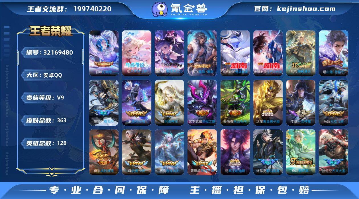 V9 2典藏 5珍品 34传说 363皮肤 128英雄 【2水晶】貂蝉-幻阙歌【5珍品传说】马可波罗-怪盗基德,鲁班七号-江户川柯南,张飞-兔狲·蓬尾,安琪拉-酷洛米之心,瑶-大耳狗之梦【34传说】曜-山海·苍雷引,孙悟空-齐天大圣,百里守约-碎云,马超-无双飞将,达摩-黄金狮子座,貂蝉-猫影幻舞,宫本武藏-地狱之眼,后羿-黄金射手座,花木兰-冠军飞将,镜-炽阳神光,铠-绛天战甲,李信-一念神魔,刘备-时之恋人,梦奇-胖达荣荣,孙尚香-末日机甲,孙悟空-地狱火,王昭君-乞巧织情,武则天-海洋之心,西施-游龙清影,虞姬-启明星使,赵云-淬星耀世,吕布-怒海麟威,诸葛亮-鹤羽星尊,干将莫邪-画中仙,典韦-战鼓燎原,澜-逐花归海,夏侯惇-霜北刀,铠-冥王哈迪斯,曜-云鹰飞将,桑启-鸣野蒿,裴擒虎-祥瑞亨通,后羿-神树通天【76史诗】元歌-无心,鬼谷子-五谷丰年,赵云-未来纪元,钟无艳-超时空战士,阿轲-暗夜猫娘,阿轲-节奏热浪,阿轲-迷踪丽影,安琪拉-心灵骇客,白起-星夜王子,百里守约-特工魅影,百里守约-朱雀志,不知火舞-魅语,蔡文姬-舞动绿茵,曹操-幽灵船长,嫦娥-拒霜思,程咬金-功夫厨神,妲己-女仆咖啡,妲己-魅力维加斯,大乔-猫狗日记,狄仁杰-魔术师,狄仁杰-鹰眼统帅,貂蝉-圣诞恋歌,伽罗-天狼溯光者,公孙离-无限星赏官,宫本武藏-鬼剑武藏,关羽-冰锋战神,韩信-白龙吟,后羿-辉光之辰,花木兰-水晶猎龙者,花木兰-瑞麟志,橘右京-修罗,铠-曙光守护者,兰陵王-暗隐猎兽者,李元芳-逐浪之夏,廉颇-地狱岩魂,刘邦-德古拉伯爵,刘禅-绅士熊喵,刘禅-天才门将,鲁班七号-电玩小子,鲁班七号-乒乒小将,吕布-圣诞狂欢,吕布-末日机甲,墨子-金属风暴,芈月-白晶晶,墨子-龙骑士,娜可露露-晚萤,裴擒虎-李小龙,司马懿-暗渊魔法,孙策-猫狗日记,孙尚香-水果甜心,孙尚香-蔷薇恋人,孙尚香-时之恋人,孙悟空-至尊宝,孙悟空-孙行者,王昭君-偶像歌手,夏侯惇-乘风破浪,小乔-缤纷独角兽,雅典娜-黎明之...