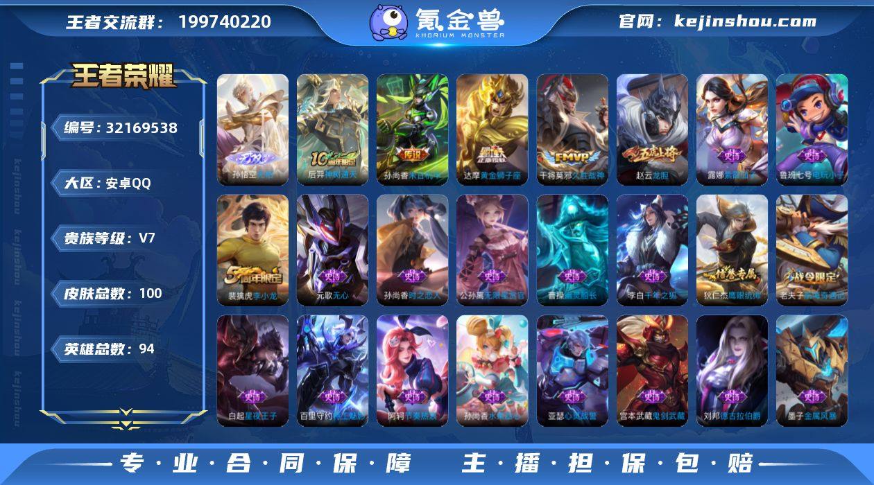 V7 1无双 1珍品 6传说 100皮肤 94英雄 【1无双】孙悟空-无相【1珍品传说】【6传说】达摩-黄金狮子座,干将莫邪-久胜战神,孙尚香-末日机甲,后羿-神树通天【25史诗】元歌-无心,阿轲-节奏热浪,白起-星夜王子,百里守约-特工魅影,蔡文姬-舞动绿茵,曹操-幽灵船长,妲己-魅力维加斯,狄仁杰-魔术师,狄仁杰-鹰眼统帅,公孙离-无限星赏官,宫本武藏-鬼剑武藏,老夫子-航海奇遇记,李白-千年之狐,刘邦-德古拉伯爵,刘禅-天才门将,露娜-紫霞仙子,鲁班七号-电玩小子,墨子-金属风暴,裴擒虎-李小龙,孙尚香-水果甜心,孙尚香-时之恋人,王昭君-偶像歌手,亚瑟-心灵战警,赵云-皇家上将,赵云-龙胆