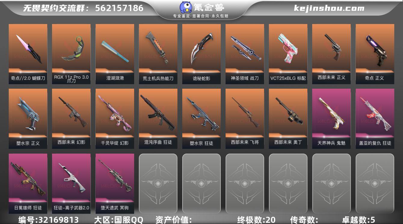 【套装】:西部未来套装 【英雄】:幻棱,炼狱,维斯,暮蝶,钛狐,壹决,铁臂,捷风,雷兹,幽影,不死鸟,贤者,猎枭,蝰蛇,零,芮娜,奇乐,尚勃勒,霓虹,斯凯,夜露,星礈,K/O,海神,盖可,黑梦,钢锁 【近战武器】:近战武器-奇点//2.0 蝴蝶刀,近战武器-RGX 11z Pro//3.0 爪刀,近战武器-黑波之刃,近战武器-澄湖潋滟,近战武器-鬼丸国纲,近战武器-未来开拓者,近战武器-荒土机兵 热能刀,近战武器-影刃,近战武器-诡秘蛇影 军刀,近战武器-神圣领域 战刀 【狂徒】:狂徒-混沌序曲,狂徒-塑水宗,狂徒-盖亚的复仇,狂徒-日冕雄师,狂徒-离子武器//2.0,狂徒-荒土机兵,狂徒-诡秘蛇影 【幻影】:幻影-千灵华绽,幻影-西部未来,幻影-神圣领域,幻影-纳米打击,幻影-末日之翼,幻影-西部未来 【戍卫】:戍卫-逆冲蛮牛,戍卫-月球哨兵,戍卫-折光棱晶 【獠犬】:獠犬-神圣领域,獠犬-逆冲蛮牛 【冥驹】:冥驹-堕天遗武,冥驹-荒土机兵,冥驹-星云暗涌 【飞将】:飞将-西部未来,飞将-末日之翼 【莽侠】:莽侠-诡秘蛇影,莽侠-月球哨兵 【战神】:战神-神圣领域 【奥丁】:奥丁-西部未来,奥丁-纳米打击,奥丁-末日之翼 【判官】:判官-诡秘蛇影,判官-纳米打击x 【雄鹿】:雄鹿-逆冲蛮牛,雄鹿-月球哨兵 【骇灵】:骇灵-荒土机兵,骇灵-星云暗涌 【蜂刺】:蜂刺-星云暗涌,蜂刺-折光棱晶 【标配】:标配-荒土机兵,标配-折光棱晶 【VCT手枪】:标配-VCT25 x BLG 【正义】:正义-奇点,正义-塑水宗,正义-西部未来,正义-纳米打击,正义-月球哨兵 【鬼魅】:鬼魅-天界神兵,鬼魅-诡秘蛇影,鬼魅-星云暗涌 【狂怒】:狂怒-神圣领域,狂怒-逆冲蛮牛 【短炮】:短炮-末日之翼 【卡面】:终章:激斗汉堡 卡面,进入射程 卡面,分崩离析 卡面,纳米打击 卡面,抑制技术 卡面,激斗汉堡 卡面,瓦娃脸雪糕 P2 卡面...