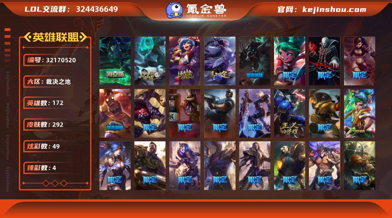 【LD5197】172英雄/292皮肤/3神话/35限定/4臻彩/49炫彩/25传说/74史诗/未定级/10周年 安妮/源代码 乐芙兰/摄魂 薇恩/天煞 劫 恒星游历者/魔女 阿卡丽 虚荣/净雪之月 莫甘娜 冬虹/红莲之刃 锐雯/碧玉之牙 卡西奥佩娅/广寒仙子 嫦娥/幸福女神 乐芙兰/圣诞开心鬼 提莫/圣诞精灵 崔丝塔娜/圣诞狂欢 努努/“主人不要我了” 阿木木/英勇玩具兵船长/冰雪节 茂凯/圣诞驯鹿 克格莫/魄罗骑士 瑟庄妮/雪球也能爆炸 吉格斯/卧虎藏龙 贾克斯/诺斯费拉图 弗拉基米尔/冠军之刃 锐雯/S1FNC 酒桶/4周年 锐雯/胜利枪神 格雷福斯/胜利女神 奥莉安娜/胜利之剑 亚托克斯/胜利枪神 卢锡安/胜利机器人 布里茨/胜利之王 泰达米尔/胜利女神 娑娜/胜利女神-菲奥娜/南瓜头 费德提克/鬼影重重 魔腾/蒙多蒙多/女猎手 希维尔/暗影 沃里克/波比的巧克力工坊/都铎王朝 图奇/防暴士兵 格雷福斯/防暴士兵 辛吉德/防暴天使 凯尔/魔幻卡牌 崔斯特/血石领主 弗拉基米尔/大天使长米迦勒 凯尔/钢铁之翼 凯尔/源计划:林 易/提莫:"约德尔人的一大步"/欧米伽小队 幽灵特工/驯龙炮手 崔丝塔娜/绅士 科加斯/双重冰晶 艾尼维亚/律政大亨 蒙多/冰霜之刃 艾瑞莉娅/女主播 迦娜/陆地王者4WD 布里茨/冰川巨兽 墨菲特/上古战魂 魔腾/第三类接触 黑默丁格/炼狱魔犬 内瑟斯/黎明使者 锐雯/苍穹之光 韦鲁斯/宇航员 诺提勒斯/女校长 菲奥娜/灌篮高手 德莱厄斯/蔷薇绅士 杰斯/星之守护者 金克丝/安伯斯与提妮/圣光审判 凯尔/战争机器 赛恩/战场公主 希维尔/月光女神阿忒弥斯 索拉卡/荒野豺狼 沃里克/法国皇室 厄运小姐/黑帮狂花 厄运小姐/女船长 厄运小姐/紫晶射手 艾希/国王 泰达米尔/百夫长 贾克斯/炼金狂士 辛吉德/小小骑士 阿木木/殇之机器人 阿木木/熔火之心 拉莫斯/全金属狂潮 拉莫斯/贵族血统 萨科/飞越疯人院 萨科/武动巅峰 萨科/战争血统 蒙多/寒冰女皇 迦娜/穿着...