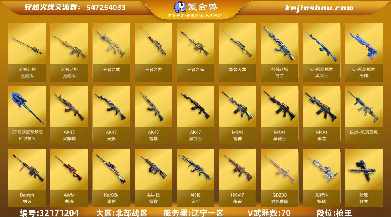辽宁一区-76V-5王者武器数-1炫金武器数 【热门武器】:QBZ03-金色蔷薇,HK417-朱雀,白虎-电玩蓝兔,Kar98K-星神,M4A1-黑骑士*3,加特林-炼狱*3,斯泰尔-蝴蝶,COP-白鲨,USP-雷暴,沙鹰-修罗*3 【王者炫金武器】:王者之武,王者之光,王者之力,炫金天龙 【音效卡】:AK47-火麒麟音效卡,M4A1-雷神音效卡,M4A1-黑骑士音效卡,Barrett-毁灭音效卡,Barrett-碧霄极光音效卡 【皮肤】:裁决-胜者为王 皮肤,雷神-暗月,雷神-虎将,AK47-火麒麟-传奇EVEN,毁灭-星空,黑龙-能量核心,超新星-傲竹金蛇 皮肤,战神-粉色甜心皮肤,战神-紫绶金章皮肤,战神-流金岁月皮肤,AWM-天龙-传奇70KG,AWM-天龙-传奇白鲨,极光-能量核心,修罗-星空,屠龙-春桃 皮肤 【角色】:零,零·纪元,乔伊教练,幻面灵狐,空,暗夜-X,初恋灵狐,嘉年华灵狐,娟娟,0号玩家,灵狐者-X,灵狐者-黄金海岸,龙儿,潘多拉-甜心教官,新娜塔莎,雪莉杨-摸金校尉 【人偶武器】:COP-白鲨,斯泰尔-蝴蝶,COP-旗袍,迷你牛牛,迷你生化手雷*2,闪光弹-小乔 【挑战大师】:神圣爆裂者III,AK47-冰龙粉碎者,激光毁灭者III-白马银枪,激光毁灭者III 【英雄级武器】:AK47-火麒麟,M4A1-黑龙,M4A1-雷神,M4A1-黑骑士*3,AK47-无影,AK47-黑武士*3,AK12-天启,AK47-雷暴,HK417-朱雀,QBZ03-金色蔷薇,王者之势-觉醒版,AK-47-猩红传说,AK47-B-战神,白虎-电玩蓝兔,黑武士-CF网剧冠军,HK417-朱雀-电竞之星,机械迷城-穹宇,Barrett-毁灭*4,AWM-裁决,Kar98K-星神,王者幻神-觉醒版,加特林-炼狱*3,AA-12-雷霆,沙鹰-修罗*3,USP-雷暴,柯尔特-电竞装甲,天神-CF网剧冠军,屠龙,龙啸,擎天,斩神刀-雷暴,擎天-CF网剧冠军,丛林匕首-玄豹,高爆手雷-雷暴*5,高爆手雷-玄豹,闪光弹-雷暴*5,闪光弹-玄豹,烟雾弹-雷暴*5,烟雾弹-玄豹,Barrett...