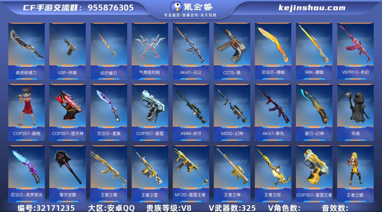 ✨精氪爆破!步狙双修!冰皮王者幻神(现代战场音效卡+狙击枪线+最终消灭冰霜)冰皮M4雷霆王者+拉丝王心+拉丝王影+2王者雷套+冰皮王锋+奉先+元让+四圣兽星象+本初+烽火连城仲达(音效卡)羸魔仁德(音效卡)幻神 蜻蜓 3COP 多近战 晴雅夏日灵狐x+多万化✨『325V-显血戒-VIP8-145级』心至尊/ 【王者武器】:/王者幻神-冰霜奇迹/M4A1-雷霆王者-冰霜奇迹/王者之尊/王者之心-HeartShot/王者之影-HeartShot/王者之神/王者之狱/王者之蝶/M12S-雷霆王者/王者之霆/COP357-雷霆王者/王者之业-冰霜奇迹/王者之魂-白金血钻/王者之击-HeartShot/王者之锋-冰霜奇迹/王心雷套/王竞雷套/ 【热门武器】:/AK47-奉先/AK47-元让/M4A1-星象-璀璨星辰·青龙(四圣兽)/VEPR12-本初/M4A1-仲达-烽火连城/M4A1-游骑兵-枪娘/AWM-妙才/MK47-仁德-羸魔/M200-幻神/98K-蜻蜓/ 【副武器】:/COP357-雷霆/COP357-堕天神/COP357-旗袍/USP-仁德-羸魔/USP-仲康/双管猎枪-文远-过载/CZ75-策/ 【近战】:/雌雄双股剑-羸魔/气勇胆烈戟/尼泊尔-星象/炽芒蝶刃/尼泊尔-蜻蜓/虎贲钩镰刀-过载/威虎碎魂刀/激昂霸王枪/墨刃-幻神/尼泊尔-竞界荣光/擎天觉醒/夺魂/屠龙*4/ 【角色】:/晴雅/夏日灵狐-X/ 【套装】(套装仅含主武器手枪近战):/仁德套/本初套/ 【其他】:/11音效卡(王者幻神+仲达+仁德)/4消灭音效/狙击枪线(机甲核心+冰霜)/按键(星象)/最终消灭-冰霜/