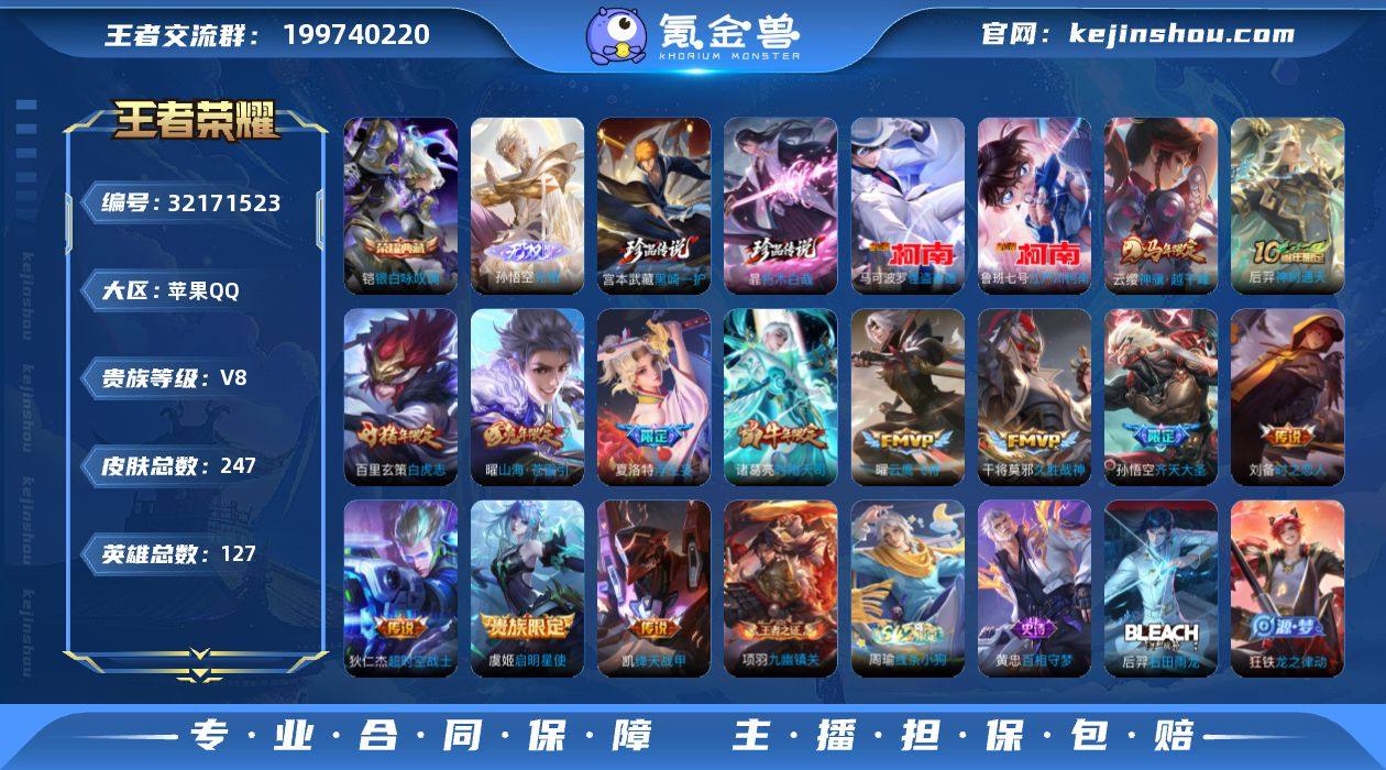 H-FZ7869 苹果QQ V8 247皮 1典藏1无双4珍品传说1星元 88限定13传说 4按键1天幕 全能高手 对抗路37段 打野22段 金标项羽庄周 171幸运值 3456星币 681英雄碎片 122皮肤碎片 2荣耀印记 营地号:2139208980【珍品传说】怪盗基德,江户川柯南,黑崎一护,朽木白哉, 【无 双】无相, 【荣耀典藏】银·白咏叹调, 【星元皮肤】时之思念, 【热门限定】神骥·越千峰,至尊宝,白虎志,神威,虎魄,龙胆,时雨天司,御风骁将,天狼绘梦者,寅虎·心曲,默契交锋女,霸王别姬男,霸王别姬女,大圣娶亲,暗影游猎,云端筑梦师,山海·玄木吟,山海·苍雷引,齐天大圣,浮生妄,启明星使,逐霄战戟, 【限定传说】猫狗日记男,久胜战神,猫狗日记女,电玩小子,云鹰飞将,苍穹之光,时之恋人男,时之恋人女,未来纪元,神迹守卫,绛天战甲,黄金分割率,超时空战士,魅语,晚萤,千年之狐,末日机甲男,无限星赏官,原初探秘者,原初追逐者,黎明之约,暗隐猎兽者,水晶猎龙者,金属风暴,地狱岩魂,曙光守护者,圣诞恋歌,逐浪之夏,紫霞仙子,功夫厨神,心灵骇客,狮舞东方,幽灵船长,乘风破浪,圣诞狂欢,星夜王子,节奏热浪,天才门将,绅士熊喵,偶像歌手,街头霸王,摇滚巨星,缤纷独角兽,星空之诺,鬼剑武藏,德古拉伯爵,银河之约,死神来了,狂想玩偶喵,单词大作战,花好人间,御旌,御銮,混沌棋,疑决卦,醍醐杖,万华元夜,拳王,霸王丸,丁香结,科学大爆炸,
