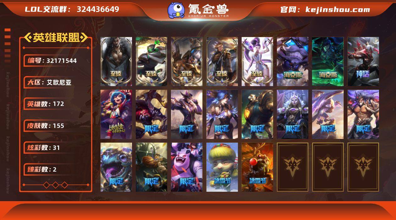 未定级段位-172英雄-155皮肤-31炫彩-0终极-11神话-14限定-15传说-30史诗 【神话皮肤】:十周年纪念安妮,神凰行者瑞羽圣凰艾尼维亚,殿堂传奇薇恩,海克斯科技吉格斯,摄魂使者薇恩,至臻征服者贾克斯,至臻KDAALLOUT卡莎,至臻灵能特工伊泽瑞尔,至臻神龙尊者炎龙瑟提 【至臻皮肤】:至臻征服者贾克斯,至臻狼神英灵斯维因,至臻灵能特工伊泽瑞尔,至臻KDAALLOUT卡莎,至臻灵魂莲华劫,至臻神龙尊者炎龙瑟提 【臻彩皮肤】:魔女阿卡丽虚荣 【海克斯皮肤】:摄魂使者薇恩,海克斯科技吉格斯 【冰雪限定】:圣诞开心鬼提莫,圣诞驯鹿克格莫 【限定皮肤】:Fnatic古拉加斯,暗杀星努努和威朗普,暗裔英雄盖伦,胜利机器人布里茨,胜利女神瑟庄妮,胜利凤凰艾尼维亚,胜利之王泰达米尔,胜利巨口克格莫,胜利女神娑娜,胜利之运崔斯特,胜利女神菲奥娜,都铎王朝图奇 【传说皮肤】:铁哥们儿奥拉夫,地狱之门卫士加里奥,邪鸦魅影乐芙兰,大天使长米迦勒凯尔,合金巨兽努努和威朗普,女皇艾希,律政大亨蒙多,电玩女神娑娜,最终BOSS维迦,地狱行者孙悟空,神龙尊者圣龙李青,战斗学院伊泽瑞尔,宇航员诺提勒斯,神王德莱厄斯,至高天派克 【史诗皮肤】:冰霜烈焰安妮,圣光审判凯尔,月光女神阿忒弥斯索拉卡,源代码索拉卡,紫晶射手艾希,夜行义贼艾瑞莉娅,恐惧新星普朗克,穿着正装的恶魔维迦,抵抗军天使凯特琳,符文战神雷克顿,暗星嘉文四世,星之守护者波比,飞车暴走族古拉加斯,钢铁意志潘森,实习护士阿卡丽,刺客信条凯南,帝王斑蝶克格莫,侏罗纪化石克格莫,星际迷航拉克丝,黑帮教父格雷福斯,驯龙女巫璐璐,生化骑士德莱厄斯,全金属狂潮杰斯,源代码卡蜜尔,屠龙勇士布隆,银河魔装机神千珏,源计划雷卢锡安,时之砂艾克,源计划自由艾克,星际之门阿兹尔 【王者皮肤】:死亡骑士内瑟斯,战地之王加...