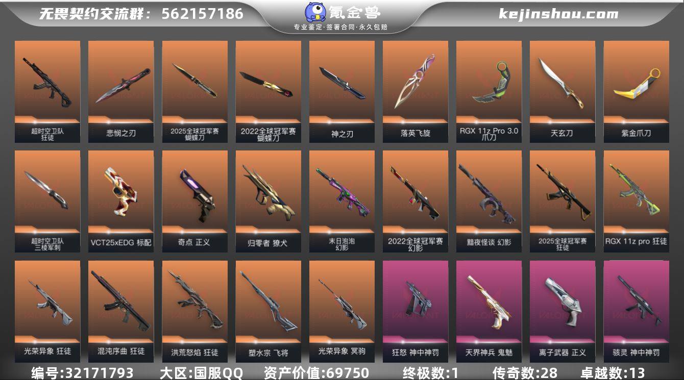 【自带包赔 可赔三倍】:库存价值69750 限定22 25 怜悯 多热门主战皮肤 性价比超值 【限定】: 无畏契约季前邀请赛 悲悯之刃, 2025全球冠军赛 蝴蝶刀, 2025全球冠军赛 狂徒, 2022全球冠军赛 幻影, 2022全球冠军赛 蝴蝶刀 【近战】: 无畏契约季前邀请赛 悲悯之刃, 超时空卫队 三棱军刺, 2025全球冠军赛 蝴蝶刀, 天玄刀, RGX 11z Pro//3.0 爪刀, 2022全球冠军赛 蝴蝶刀, 紫金爪刀, 神之刃, 落英飞旋 【狂徒】: 洪荒怒焰 狂徒, 日冕雄师 狂徒, 2025全球冠军赛 狂徒, RGX 11z Pro 狂徒, 堕天遗武 狂徒, 冰点凝冻 狂徒, 光荣异象 狂徒, 超时空卫队 狂徒, 混沌序曲 狂徒, 掠影 狂徒 【幻影】: 末日泡泡 幻影, 黯夜怪谈 幻影, 般若假面 幻影, 2022全球冠军赛 幻影, 神中神罚 幻影 【冥驹】: 离子武器 冥驹, 光荣异象 冥驹 【正义】: 离子武器 正义, 奇点 正义 【戍卫】: 掠影 戍卫 【獠犬】: 归零者 獠犬 【鬼魅】: 天界神兵 鬼魅 【骇灵】: 神中神罚 骇灵 【标配】: VCT25 x EDG 标配 【狂怒】: 神中神罚 狂怒 【飞将】: 塑水宗 飞将 【莽侠】: 神中神罚 莽侠 【概要】: 总皮肤 111 终极 1 传奇 28 卓越 13 刀皮 英雄 28 LV 191 历史最高:超凡 当前段位:铂金二 已使用 1335 R点 剩余 5 R点 不可二次 卡面、挂饰、其他皮肤请看截图 道具、段位等以实际验号为准。如账号因没有维护,赛季更新等不可抗因素发生变化,不属于账号质量问题"