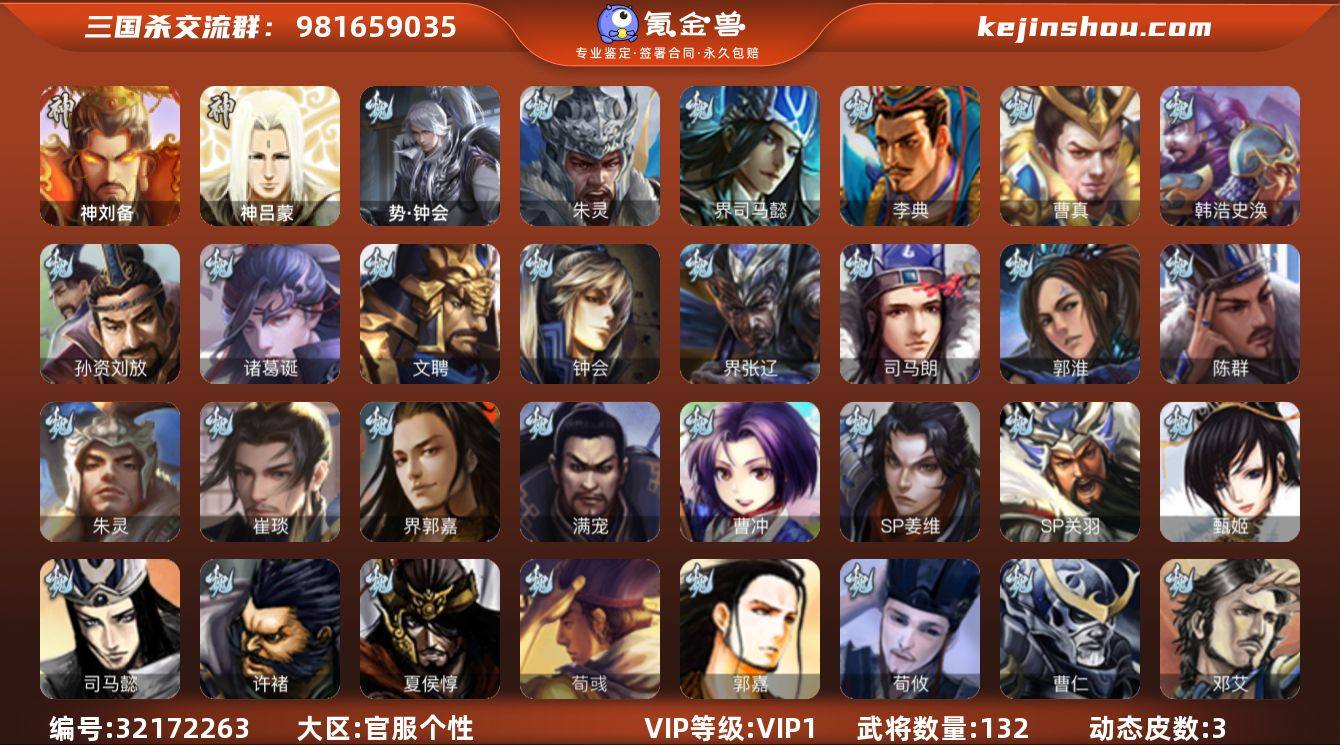 VIP等级: VIP1 官阶: 校尉 武将数量: 132 动态皮肤数量: 3 神将: 神刘备,神吕蒙 魏国武将: 张辽,SP关羽,SP贾诩,SP姜维,曹操,曹冲,曹丕,曹仁,满宠,荀攸,郭嘉,荀彧,界郭嘉,崔琰,朱灵,陈群,郭淮,夏侯惇,司马朗,许褚,界张辽,钟会,文聘,诸葛诞,司马懿,甄姬,孙资刘放,韩浩史涣,曹真,夏侯渊,李典,邓艾,界司马懿,朱灵(国战),势钟会 蜀国武将: 沙摩柯,徐庶,界诸葛亮,界张嶷,赵云,张松,界刘备,刘封,黄月英,关羽,吴懿,张飞,黄皓,魏延,马忠,刘禅,界赵云,关银屏,卧龙诸葛,周仓,界关兴张苞,诸葛亮,赵统赵广,界马岱,关平,庞统,马超,廖化,关兴张苞,孟获,黄忠,刘备,界马超,马良,蜀-糜芳傅士仁,SP甘夫人 吴国武将: 周泰,吕蒙,蒋钦,孙休,界孙权,孙尚香,程普,大乔,韩当,陆逊,诸葛瑾,虞翻,界黄盖,孙鲁班,界周瑜,界潘璋马忠,孙权,界甘宁,甘宁,界大乔,孙坚,孙鲁育,周瑜,小乔,黄盖,吕岱,孙策,界陆逊,张昭张纮,吴-糜芳傅士仁,孙邵 群国武将: 许攸,伏完,刘协,华雄,袁术,高顺,于吉,吕布,李儒,公孙瓒,王濬,蔡夫人,界袁术,陈宫,界华佗,贾诩,张宝,刘表,何太后,谋卢植,袁绍,华佗,貂蝉,严白虎,颜良文丑,谋高顺,贾充,纪灵,乐就