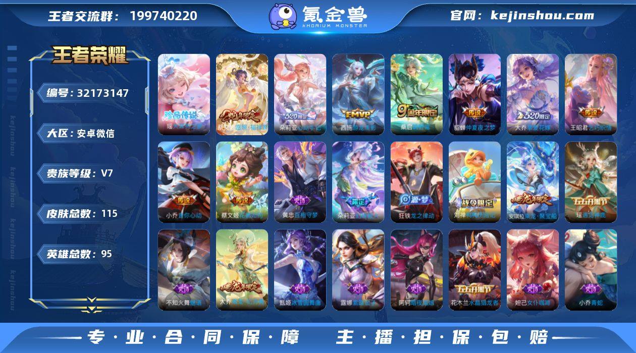 实名: 可修改 性别: 女号 贵族等级: V7 英雄数: 95 皮肤数: 115 珍品传说: 大耳狗之梦 传说皮: 仲夏夜之梦,音你心动-小乔,乞巧织情,游龙清影,花朝如约,挚爱花嫁,朵莉亚心动手记 限定皮: 魔法小厨娘,鸣野蒿,愿照·福禄聚 亮点: 【优质装备】:大耳狗之梦,仲夏夜之梦(大飞蛾),音你心动-小乔,乞巧织情,游龙清影(小青龙),花朝如约(花篮子),挚爱花嫁,朵莉亚心动手记