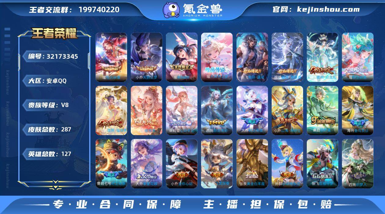 127英雄-287皮肤-安卓QQ/高质量女号/全皮瑶西施大乔朵利亚嫦娥桑启少司缘海月/19按键/2星传说/1天幕/至尊星耀/287皮肤/127英雄/2典藏/1无双/3珍品传说/20传说/95史诗/8稀有英雄 【3 珍品传说】大耳狗之梦 瑶,器灵·落星盏 嫦娥,兔狲·蓬尾 张飞, 【2 典藏皮肤】天鹅之梦 小乔,拾光映像 瑶, 【1 无双皮肤】真我赫兹 瑶, 【20 传说皮肤】启明星使 虞姬,时之祈愿 瑶,飞鸢探春 李元芳,游龙清影 西施,神骥·鸣幻洲 朵莉亚,时之奇旅 鲁班七号,音你心动 小乔,山海·琳琅生 小乔,百相守梦 张飞,小动物乐团 孙膑,时之奇旅 大乔,挚爱花嫁 大乔,黄金白羊座 张良,金乌负日 海月,心动手记 朵莉亚,愿照·众生和 妲己,愿照·福禄聚 蔡文姬,神树通天 后羿,鸣野蒿 桑启,续相思 西施, 【95 史诗皮肤】时之奇旅 安琪拉,电玩小子 鲁班七号,末日机甲 吕布,蔬乡物语 鲁班七号,紫霞仙子 露娜,百解令 蒙犽,云端筑梦师 庄周,乘龙·忆丹青 大乔,燃音魔法 高渐离,白鹤梁神女 大乔,猫狗日记 大乔,德古拉伯爵 刘邦,心灵战警 亚瑟,五谷丰年 鬼谷子,银翎春语 杨玉环,诗语江南 西施,巫礼祀神 少司缘,鬼剑武藏 宫本武藏,迷踪丽影 阿轲,幻珠鲛人 朵莉亚,至美·乘鲤谣 西施,线条小狗 周瑜,玉兔公主 公孙离,摇滚巨星 嬴政,拒霜思 嫦娥,魅力维加斯 妲己,黄金分割率 诸葛亮,乐园奇幻夜 钟馗,如梦令 嫦娥,偶像歌手 王昭君,女仆咖啡 妲己,白蛇 大乔,晚萤 娜可露露,遇见神鹿 瑶,舞动绿茵 蔡文姬,繁星吟游 蔡文姬,鹰眼统帅 狄仁杰,胡桃异想国 米莱狄,光弋星穹 莱西奥,纤云弄巧 云中君,金属风暴 墨子,猫狗日记 孙策,逐浪之夏 李元芳,时之彼端 妲己,石田雨龙 后羿,鸭鸭历险记 刘禅,驭风魔法 戈娅,魔术师 狄仁杰,龙之律动 狂铁,唤灵魅影 貂蝉,顽岩魄 蒙犽,皇家上将 赵云,冰冠公主 雅典娜,涂山红红 少司缘,功夫厨神 程咬金,电玩·爆裂旋风 刘禅,天才门将 刘禅,圣诞恋歌 貂...