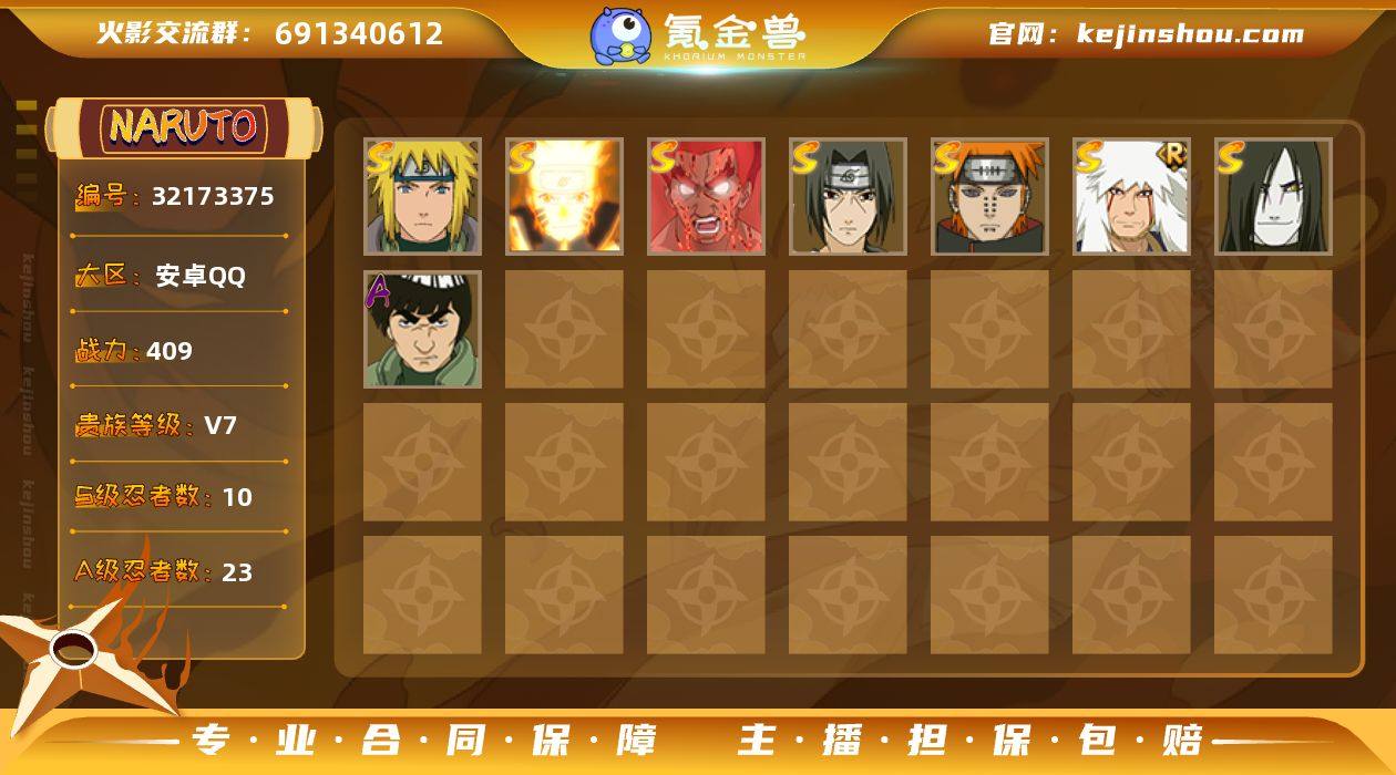 安卓QQ-可二次-v7成品号-S忍者数:10- A忍者数:23 【S级忍者】迈特凯「死门」(3星),宇智波斑「秽土转生·解」(3星),漩涡鸣人「九喇嘛连结」(3星),波风水门「九喇嘛连结」(3星),自来也「舞之豪杰」(3星),宇智波鼬「须佐能乎」(3星),漩涡鸣人·宇智波佐助(3星),佩恩「天道」(3星),波风水门(3星),大蛇丸(3星), 【A级忍者】漩涡鸣人「仙人模式」(2星),漩涡鸣人「九尾查克拉」(2星),宇智波鼬「新春限定」(2星),千代「近松十人卫」(2星),志村团藏(2星),奇拉比(2星),干柿鬼鲛(2星),猿飞阿斯玛(2星),迈特凯(2星),蝎(2星),我爱罗「疾风传」(2星),飞段(3星),飞段「死司凭血」(3星),波风水门「青年」(2星),达鲁伊「五代目雷影」(2星),艾「青年」(2星),长门「青年」(2星),旗木卡卡西「万花筒写轮眼」(2星),小南「神驹佑将」(2星),漩涡博人「桃式显现」(2星),宇智波鼬「夏日限定」(2星),迈特凯「青春爆炸」(2星),巳月「仙人模式」(2星),