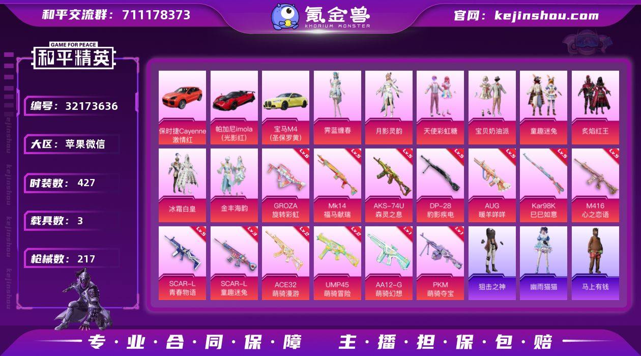 YM9509-13特8粉3载具/红保时捷 红帕加尼 黄宝马/彩虹裙 奶油裙 童趣迷兔 小丑鱼 月影灵韵 霁蓝缠春 旋转彩虹 心之恋语 青春物语 童趣迷兔 森灵 咩咩 福马 实名: 可修改 时装数: 427 载具数: 3 枪械数: 217 战备数: 147 热门装扮: 宝贝奶油派,天使彩虹糖,炙焰红王,冰霜白皇,童趣迷兔,金丰海韵,月影灵韵,霁蓝缠春 载具: 帕加尼imola(光影红),宝马M4(圣保罗黄),保时捷Cayenne(激情红) 稀有枪皮: M416心之恋语,SCAR-L童趣迷兔,SCAR-L青春物语,GROZA旋转彩虹,Kar98K-巳巳如意,AUG-暖羊咩咩,DP-28-豹影疾电,AKS-74U-森灵之息,AA12-G-萌骑幻想,ACE32-萌骑漫游,PKM-萌骑夺宝,UMP45-萌骑冒险