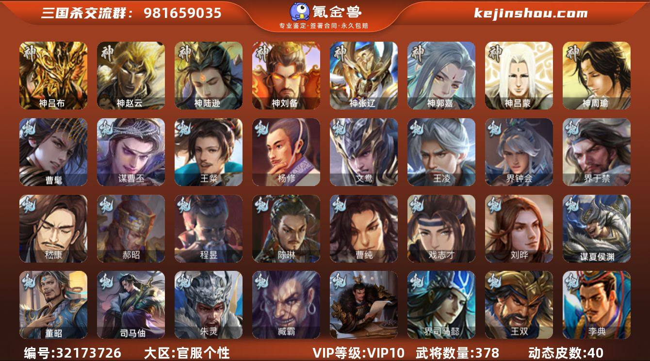 VIP等级: VIP10 官阶: 大将军 武将数量: 378 动态皮肤数量: 40 神将: 神郭嘉,神刘备,神陆逊,神吕布,神张辽,神赵云,神吕蒙,神周瑜 魏国武将: 刘晔,戏志才,曹纯,陈琳,程昱,郝昭,嵇康,界于禁,界钟会,王凌,文鸯,杨修,王粲,唐咨-魏,张辽,SP蔡文姬,SP关羽,SP贾诩,SP姜维,SP庞德,卞夫人,蔡贞姬,曹昂,曹操,曹冲,曹洪,曹丕,曹仁,曹叡,王异,张恭,鲁芝,界满宠,曹休,界曹植,满宠,荀攸,王基,钟繇,蒯越蒯良,郭嘉,牵招,荀彧,阮慧,杜畿,崔琰,界曹丕,界荀彧,朱灵,界甄姬,吕虔,界王异,界许褚,界郭淮,华歆,陈群,界邓艾,界典韦,袁涣,李通,乐进,辛宪英,郭淮,毛玠,郭皇后,夏侯惇,曹植,司马朗,谋于禁,界曹操,许褚,界张辽,谋徐晃,张郃,钟会,文聘,曹彰,界夏侯惇,诸葛诞,司马懿,甄姬,界徐晃,徐晃,韩浩史涣,胡班,曹真,谋曹丕,典韦,界夏侯渊,夏侯渊,李典,于禁,王双,邓艾,界司马懿,孟达-魏,臧霸,朱灵(国战),曹髦,司马伷,董昭,谋夏侯渊 蜀国武将: 董允,花鬘,谯周,沙摩柯,王平,赵襄,周群,诸葛瞻,谋马超,马云騄,徐庶,杨仪,吕凯,界关羽,界诸葛亮,邓芝,界伊籍,费祎,严颜,界黄月英,界张嶷,赵云,张松,彭羕,李丰,界刘备,刘封,谋庞统,黄月英,关羽,王甫赵累,吴懿,吴班,祝融,张飞,陈震,魏延,界周仓,马忠,界法正,糜夫人,界孟获,刘禅,界赵云,谋诸葛亮,界姜维,张翼,关银屏,界祝融,SP孙尚香,SP徐庶,卧龙诸葛,宗预,周仓,简雍,界关兴张苞,诸葛亮,孙乾,界张飞,界卧龙诸葛,法正,界简雍,赵统赵广,陈到,界马岱,关平,马岱,界庞统,庞统,诸葛果,谋张飞,马超,霍峻,廖化,关兴张苞,孟获,夏侯氏,姜维,黄忠,刘备,李严,马良,傅肜,蒋琬费祎,许靖,刘谌,彭羕(国战),甘夫人,蜀-糜芳傅士仁,SP甘夫人,势魏延,势陈祗 吴国武将: 贺齐,界徐盛,界朱然,留赞,孙皓,吴景,文鸯,潘濬,周泰,全琮,吕蒙,诸葛恪,界孙尚香,界顾雍,大乔小乔,谋甘宁,桥公,谋周瑜,界程普,丁奉,谋吕蒙,周鲂,界全琮,孙茹,...