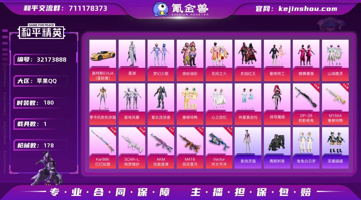 苹果 手Q-15粉装-7特效枪-1载具-1粉色飞行器-63089热力值-13王牌印记-180套装-178枪皮 【热门品类】:粉装-梦幻火箭,粉装-缤纷油彩,套装-小丑鱼,角色-军刀雅典娜,套装-龟仙人,套装-粉红小猪,角色-8号机,角色-Mark.06 【粉色载具】:路特斯EVIJA(星际黄) 【粉色套装】:粉装-梦幻火箭,粉装-缤纷油彩,粉装-花间之火,粉装-炙焰红王,粉装-蜜桃特工,粉装-蝶舞蔷薇,粉装-山涧鹿灵,角色-零号机款机体服,粉装-紫电风暴,角色-复仇流浪者,粉装-垂柳戏鸭,粉装-心之回忆,粉装-仲夏莫吉托,角色-绯穹魔姬,角色-星渊 【粉色枪皮等级】:AKM-炫紫旋律(一级),M16A4-垂柳戏鸭(五级),SCAR-L-纯梦嫁纱(二级),M416-风花雪月(一级),Vector-环太平洋(一级),Kar98K-巳巳如意(五级),DP-28-豹影疾电(五级) 【粉色枪皮】:AKM-炫紫旋律,M16A4-垂柳戏鸭,SCAR-L-纯梦嫁纱,M416-风花雪月,Vector-环太平洋,Kar98K-巳巳如意,DP-28-豹影疾电 【粉色飞行器】:梦幻火箭飞行器 【粉色降落伞】:梦幻火箭降落伞,花间之火降落伞,枪炮玫瑰降落伞,林间仙鹿降落伞,碧影闪光降落伞,恐龙拽拽降落伞,甜梦小狐降落伞,环太平洋降落伞,垂柳戏鸭降落伞,彩虹甜喵降落伞,炫光之旅降落伞,创世·救赎降落伞,初号机 觉醒Ver.降落伞 【稀有套装】:套装-龟仙人,套装-雏菊兔兔,套装-萝兰蝴蝶,角色-灵公主,角色-紫俏灵猫 【稀有枪皮】:AKM-彩虹符号,AKM-恐龙拽拽,AKM-灼热熔岩,AKM-环太平洋,AKM-龙的传人,M16A4-幻世战舞者,M16A4-甜心亚梦,SCAR-L-炫彩节奏,SCAR-L-玉兔迎春,SCAR-L-红色方程式,SCAR-L-冷漠罗丽,M416-糯团青竹,M416-红色方程式,M416-蓝色火焰,GROZA-异彩先驱,GROZA-影袭,GROZA-紫翼圣骑,AUG-天降萌叽,AUG-耀粉歌者,QBZ-彩虹符号,QBZ-飞驰魅影,M762-天降萌叽,M762-彩虹甜喵,Mk47-...