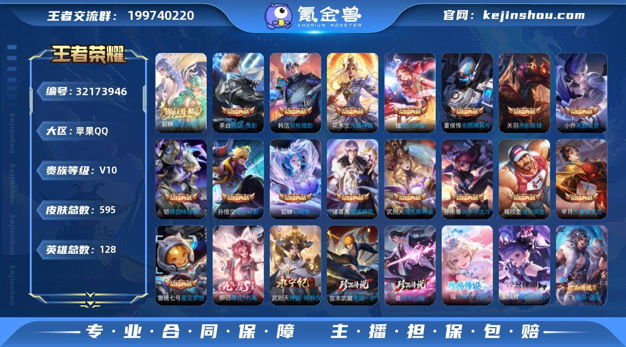 【精品V10·鲤跃龙门背景·17典藏·3W流光积分·馥梦繁花·2无双·5珍品·15星传说·12天幕·全皮武则天·紫瑶·玉鸾吟·寅虎焰心·猪年全限定·鼠年全限定·牛年全限定·虎年全限定·兔年全限定·可二次】YXw17026-苹果Q-128英雄-595皮肤-19王者印记-300铭文-贵族积分53w【贵族10】【17典藏·1珍品无双·2无双·5珍品·15星传说·87传说·12天幕·90按键·324个性戳戳】【因赛季更新游戏段付以上号为准!】 【英雄全皮】:刘禅全皮,武则天全皮,孙权全皮,娜可露露全皮,橘右京全皮,张飞全皮,雅典娜全皮,苏烈全皮,梦奇全皮,沈梦溪全皮,狂铁全皮,盾山全皮,猪八戒全皮,敖隐全皮,鲁班大师全皮,阿古朵全皮,夏洛特全皮,金蝉全皮,空空儿全皮,影全皮 【荣耀典藏】:武则天英雄,孙悟空全息碎影,武则天倪克斯神谕,夏侯惇无限飓风号,小乔天鹅之梦,孙尚香杀手不太冷,鲁班七号星空梦想,芈月大秦宣太后,程咬金活力突击,李白鸣剑曳影,诸葛亮星域神启,花木兰九霄神辉,关羽赤影疾锋,铠银白咏叹调,貂蝉幻阙歌,韩信弑枪猎影,瑶拾光映像 【珍品无双】:貂蝉馥梦繁花 【无双皮肤】:妲己青丘九尾,武则天神器明辉仪 【珍品传说】:宫本武藏黑崎一护,暃朽木白哉,安琪拉酷洛米之心,瑶大耳狗之梦,张飞兔狲蓬尾 【星元皮肤】:王昭君乞巧织春,李白玉鸾吟,虞姬黛羽霜翎,刘备时之羁绊,鲁班七号寅虎焰心,虞姬无限倾慕,狄仁杰星际治安官,刘备时之思念,瑶时之愿境,孙悟空零号雷霆,孙尚香未来机甲,武则天幻海之心,孙悟空幽冥火,宫本武藏幽冥之眼,貂蝉金色仲夏夜 【天幕】:无尽之约天幕,鸿兔大展天幕,幻夜逐光天幕,凤鸣九霄天幕,路在脚下天幕,浪翻一夏天幕,挚爱童话天幕,花朝如约天幕,金虎啸春天幕,秋月华灯天幕,鲲天幕,共赏芳华天幕 【传说皮肤】:后羿神树通天,公孙离云诺千山,西施续相思,蔡文姬愿照福...