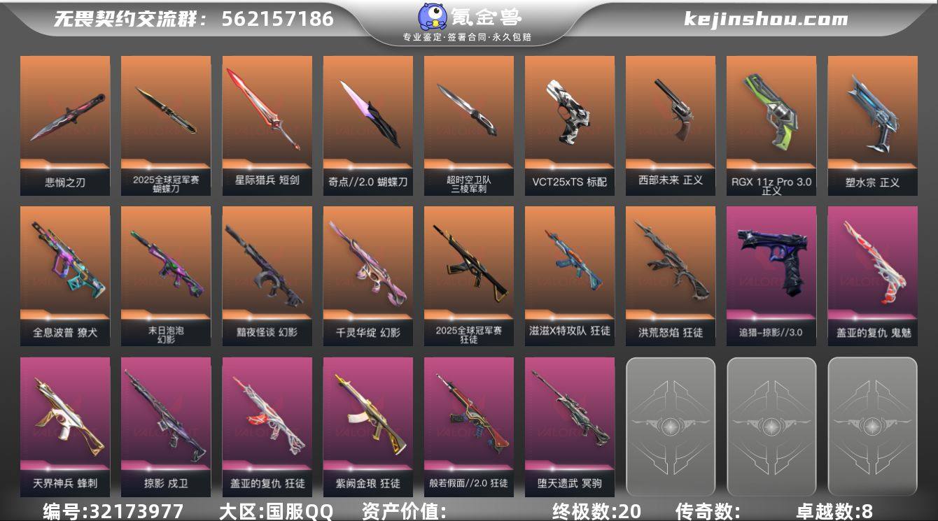 【套装】:2025全球冠军赛套装,无畏契约季前邀请赛套装 【英雄】:幻棱,炼狱,维斯,暮蝶,钛狐,壹决,铁臂,捷风,雷兹,幽影,不死鸟,贤者,猎枭,蝰蛇,零,芮娜,奇乐,尚勃勒,霓虹,斯凯,夜露,星礈,K/O,海神,盖可,黑梦,钢锁 【近战武器】:近战武器-2025全球冠军赛 蝴蝶刀,近战武器-碎心裂刃,近战武器-无畏契约季前邀请赛 悲悯之刃,近战武器-影钩,近战武器-超时空卫队 三棱军刺,近战武器-奇点//2.0 蝴蝶刀,近战武器-镭切,近战武器-星际猎兵 短剑 【狂徒】:狂徒-2025全球冠军赛,狂徒-洪荒怒焰,狂徒-滋滋X特攻队,狂徒-般若假面//2.0,狂徒-盖亚的复仇,狂徒-紫阙金琅 【幻影】:幻影-黯夜怪谈,幻影-千灵华绽,幻影-末日泡泡 【戍卫】:戍卫-掠影 【獠犬】:獠犬-全息波普 【冥驹】:冥驹-堕天遗武 【骇灵】:骇灵-无限竞技 【蜂刺】:蜂刺-天界神兵 【追猎】:追猎-掠影//3.0 【VCT手枪】:标配-VCT25 x TS 【正义】:正义-RGX 11z Pro//3.0,正义-塑水宗,正义-西部未来 【鬼魅】:鬼魅-盖亚的复仇 【卡面】:激斗汉堡 卡面,欢迎来到底城 卡面,南瓜盛典 卡面,正义的化身 卡面,Clutch 卡面,无畏契约GO!第一卷:芮娜 卡面,清除名单 卡面,无畏契约GO!第一卷:零 卡面,别冒尖 卡面,代号红色 卡面,新兵报到 卡面,V契约 卡面,无畏契约 卡面 【喷漆】:买装还是存钱 喷漆,红鳞 喷漆,暴走萝莉 喷漆,松叶 喷漆,放下武器 喷漆,胜利属于无畏契约 喷漆,GLHF 喷漆,无畏契约 喷漆 【挂饰】:第九季//第三幕 纪念币 挂饰,第九季//第二幕 纪念币 挂饰,天外飞客 挂饰,《双城之战》魄罗 挂饰,无畏契约 纪念币 挂饰