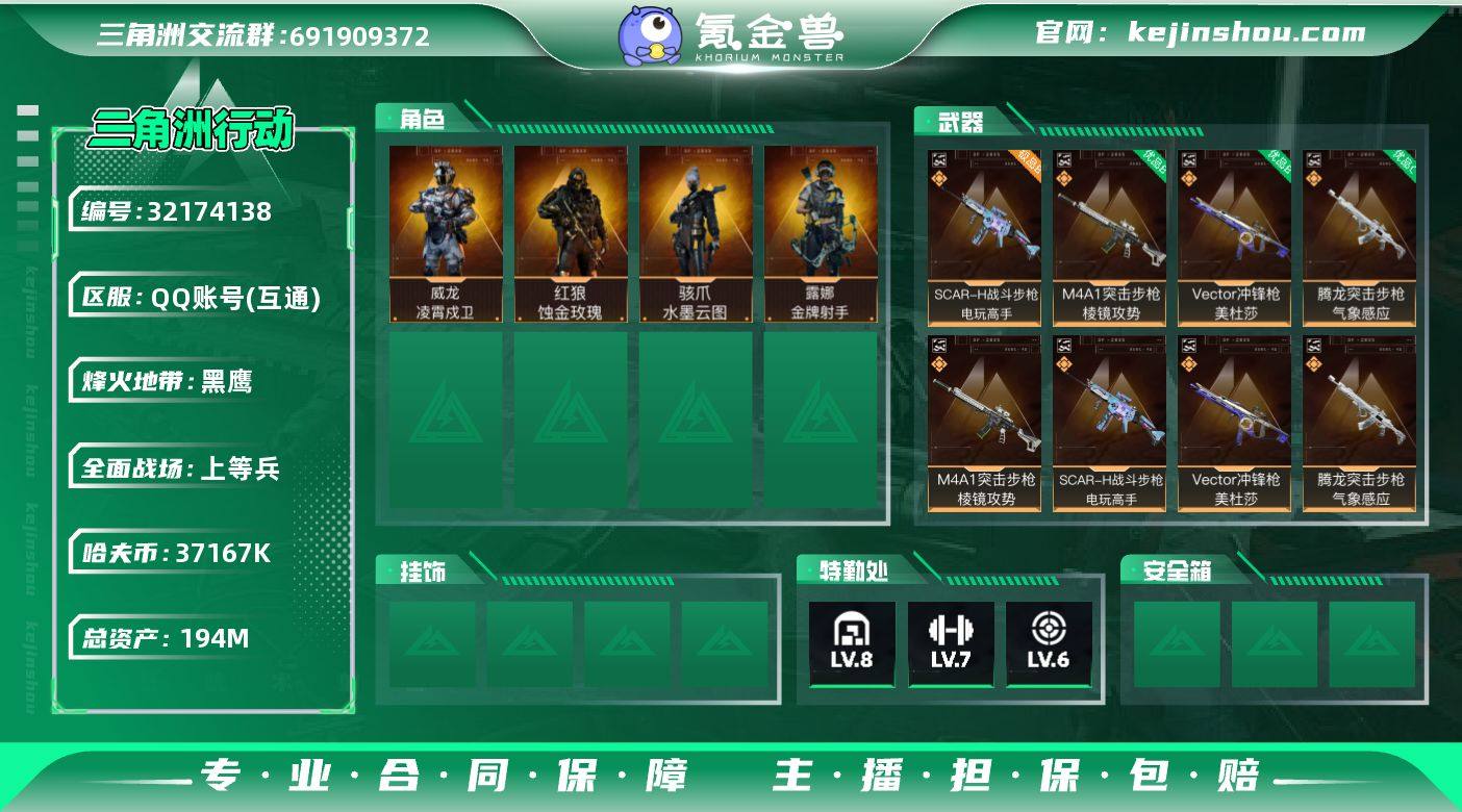 【Hsj640】【特价秒杀】【总资产194M流动资产144M哈夫币3716w】可二次--全面战场等级:23/烽火地带等级:60【蚀金玫瑰,水墨云图,凌霄戍卫,暗星,信条,龙牙】SCAR-H战斗步枪-电玩高手(宝石蓝极品B)/腾龙突击步枪-气象感应(电属性优品C) 【干员外观】:红狼-蚀金玫瑰,骇爪-水墨云图,威龙-凌霄戍卫,露娜-金牌射手 【近战皮肤】:近战-暗星,近战-信条,近战-龙牙,近战-黑鹰 【典藏外观】:M4A1突击步枪-棱镜攻势,SCAR-H战斗步枪-电玩高手,Vector冲锋枪-美杜莎,腾龙突击步枪-气象感应 【典藏外观成色】:M4A1突击步枪-棱镜攻势(优品B),SCAR-H战斗步枪-电玩高手(极品B),Vector冲锋枪-美杜莎(优品B),腾龙突击步枪-气象感应(优品C) 【传说外观】:M4A1突击步枪-蚀金玫瑰,QBZ95-1突击步枪-凌霄戍卫,K416突击步枪-行动记录,SG552突击步枪-运动员,SCAR-H战斗步枪-水墨云图,腾龙突击步枪-万金泪冠,MK47突击步枪-暗星,P90冲锋枪-信条,Vector冲锋枪-夜莺,SR-3M紧凑突击步枪-暗星,勇士冲锋枪-万金泪冠,MK4冲锋枪-夜莺,PKM通用机枪-荼蘼,Mini-14射手步枪-夜莺,M14射手步枪-蛮荒,M14射手步枪-缄花,SR-25射手步枪-信条,AWM狙击步枪-万金泪冠 【史诗外观】:K437突击步枪-私人定制,ASh-12战斗步枪-碎冰行动,PTR-32突击步枪-碎冰行动,K416突击步枪-冬日风情,K416突击步枪-腊梅,AUG突击步枪-蝮蛇,M7战斗步枪-百步穿杨,SCAR-H战斗步枪-囚徒,G3战斗步枪-流沙送葬,AS Val突击步枪-百步穿杨,腾龙突击步枪-猎鳄行动,KC17突击步枪-缄默情歌,MP5冲锋枪-深海恐惧,MP5冲锋枪-竞技风,Vector冲锋枪-百步穿杨,勇士冲锋枪-丛影谍踪,MP7冲锋枪-六套之力,PKM通用机枪-阿萨拉特攻,M249轻机枪-丛影谍踪,QJB201轻机枪-炽焰,VSS射手步枪-丛影谍踪,M14射手步枪-工业狂潮, M14射手步枪-航天庆典,M700...