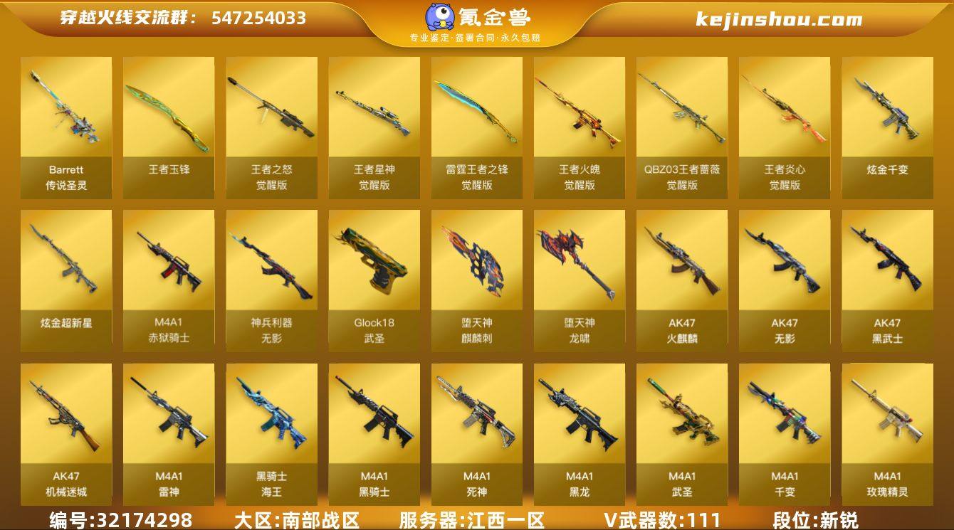 江西一区-121V-14王者武器数-2炫金武器数 【传说武器】:传说圣灵 【热门武器】:传说圣灵,QBZ03-金色蔷薇,Scar Light-白虎*2,HK417-朱雀,M200-幻神*2,M200-竞技荣光,荣耀世冠-火麒麟,荣耀世冠-雷神,白虎-电玩蓝兔,柯尔特-冠军之特,荣耀世冠-柯尔特*4,M4A1-黑骑士,汤姆逊-烈龙*7,RPK-盘龙*6,加特林-炼狱*3,斯泰尔-蝴蝶,羊驼玩偶,USP-雷暴,沙鹰-修罗*6,荣耀世冠-龙啸,金刚伞 【王者炫金武器】:王者玉锋,炫金千变,炫金超新星,王者之魄高爆手雷,王者之魄闪光弹*3 【音效卡】:M200-幻神音效卡,M4A1-雷神音效卡,M4A1-黑骑士音效卡,Barrett-毁灭音效卡,QBZ03-金色蔷薇音效卡,N9语音包,Barrett-碧霄极光音效卡 【皮肤】:幻神-AG-CFPLS17冠军,QBZ03-冠军之薇,裁决-胜者为王 皮肤,雷神-荣耀之魄,雷神-冠军之魄,雷神-R.LGD-CFPLS18冠军,雷神-荣耀世冠AG,火麒麟-冠军之心,火麒麟-平天大圣,毁灭-荣耀之怒,毁灭-SV-CFPLS16冠军,毁灭-英雄计划 皮肤,M4A1-千变-孔明皮肤,黑骑士-冠军之势,黑骑士-AG-S4冠军典藏,死神-机甲核心皮肤,战神-紫绶金章皮肤,极光-能量核心,炼狱-星空,修罗-星空,屠龙-荣耀之锋,屠龙-荣耀世冠AG*3,龙啸-青青莓果 皮肤,擎天-秘银 【角色】:樱,电竞教官-云悠悠,王者复仇,王者凌霄,王者-魅影,王者沙漠玫瑰,云海玲珑,暗夜-X,初恋灵狐,芳心审判者,嘉年华灵狐,娟娟,零-水下丽影,灵狐者-职业经理,麻雀,潘多拉-X,潘多拉-甜心教官,铁骑荣耀,职业选手 【人偶武器】:天龙-曼陀罗,斯泰尔-蝴蝶,AWM-灵狐-15周年嘉年华,COP-旗袍,迷你波特博士*6,迷你火种*4,迷你生化手雷,生化手雷-机甲核心,深渊终结者手雷,迷你超能女侍,灵狐娃娃手雷 【暴走生化】:异变清道夫 【挑战大师】:神圣爆裂者III,冰龙粉碎者-白马银枪,VEPR-12-金魔,...