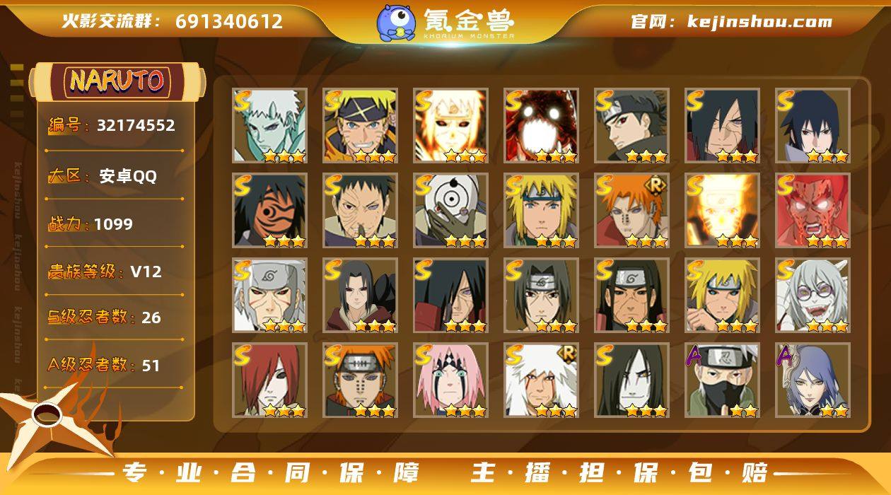MCK630818 【(可转苹果)忍法帖已开!1099W战力 白破超 死水 绿牛26S+298点券小孩+盾狗 面麻8个198直购51A+4直购通灵+雨隐主场景+虎年决斗场景+98片罗砂一堆S碎片】 战力1099 账号等级148 忍者总数221 游戏大区2115 魅力值13700 S忍碎片数量3337 【暂时不可修改】 【榜五百内】 【VIP12】 S级忍者26 A级忍者51 通灵兽22 秘卷1 时装14 替身4 决斗场景2 主场景2 决斗幕布3 S级忍者:秽土转生宇智波斑,忍界大战宇智波带土,忍界大战春野樱,红夜之刃神秘面具男,秽土转生解宇智波斑,秽土转生千手扉间,舞之豪杰自来也,暴怒第六尾漩涡鸣人,漩涡鸣人·宇智波佐助,死门迈特凯,十尾人柱力宇智波带土,波风水门,仙人模式药师兜,大蛇丸,须佐能乎宇智波鼬,天道佩恩,九喇嘛连结漩涡鸣人,永恒万花筒宇智波佐助,须佐能乎宇智波止水,九喇嘛连结波风水门,超佩恩天道,白面具宇智波斑,秽土转生宇智波鼬,秽土转生长门,秽土转生波风水门,秽土转生千手柱间; A级忍者:最终章日向雏田,新春限定宇智波鼬,神驹佑将小南,宇智波泉奈,六代目水影长十郎,忍者之路神秘面具男,死司凭血飞段,五代目雷影达鲁伊,新春限定迪达拉,漂泊浪客佩恩六道,桃式显现漩涡博人,仙人模式巳月,不缘,忍界大战奇拉比,新春限定大蛇丸,晓大蛇丸,羁绊神农,忍界大战土台,四代目土影黑土,神威对决旗木卡卡西,青春爆炸迈特凯,百豪春野樱,忍界大战秋道丁次,忍界大战日向宁次,秽土转生迪达拉,秽土转生桃地再不斩,近松十人卫千代,新春限定波风水门,迈特凯,初始形态机械鸣人,宇智波鼬,干柿鬼鲛,疾风传我爱罗,迪达拉,青年长门,蝎,飞段,猿飞阿斯玛,奇拉比,小南,仙人模式漩涡鸣人,万花筒写轮眼宇智波佐助,青年波风水门,青年艾,新春限定宇智波止水,漂泊武士千手扉间,宇智波止水,万花筒写轮眼旗木卡卡西,须...