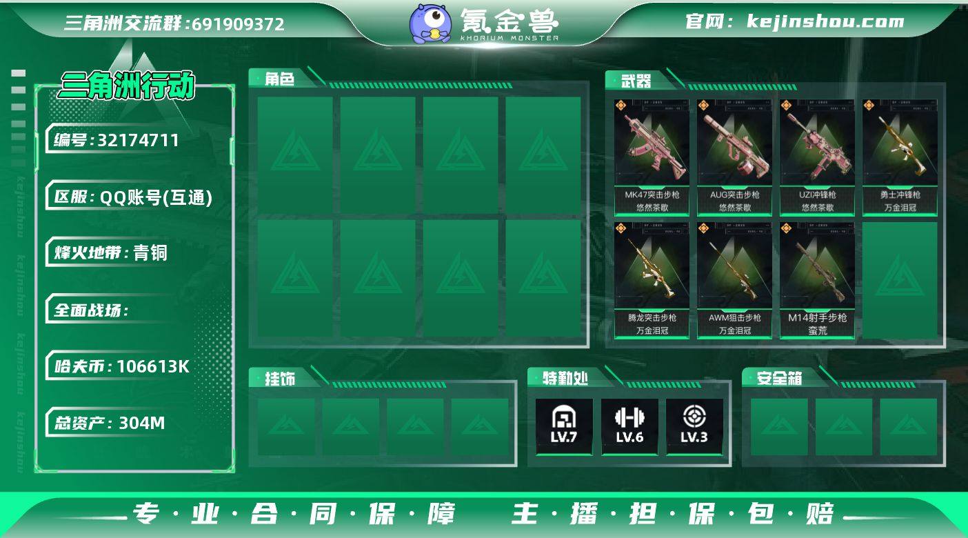 "YXB-纯绿无封-106613k哈伏币-总资产304m流动资产281m-60烽火等级-青铜-1战场等级-无军衔 【近战皮肤】:近战-黑鹰 部门12211特勤处仓库7训练中心6靶场3 【传说外观】:M14射手步枪-蛮荒 【史诗外观】:K416突击步枪-腊梅,K416突击步枪-阿萨拉特攻,K437突击步枪-丛影谍踪,MP5冲锋枪-深海恐惧,SMG-45冲锋枪-阿萨拉特攻,SR-3M紧凑突击步枪-开工大吉,勇士冲锋枪-深海恐惧,勇士冲锋枪-丛影谍踪,PKM通用机枪-阿萨拉特攻,M249轻机枪-丛影谍踪,VSS射手步枪-丛影谍踪, M14射手步枪-航天庆典,M700狙击步枪-蝮蛇,M700狙击步枪-哈夫克警备,沙漠之鹰-曙光 【挂饰】:挂饰-崩岩重炮,挂饰-暗行哨兵,挂饰-福禄,挂饰-聚宝盆,挂饰-卡皮巴拉,挂饰-紧急撤离,挂饰-麻将 "