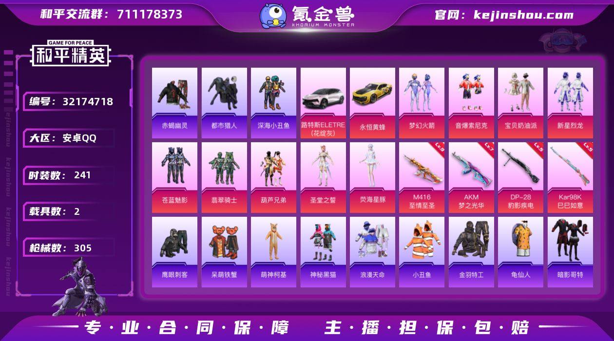 【kyhp983】安卓 手Q-9粉装-6特效枪-2载具-1粉色飞行器-97043热力值-21王牌印记-241套装-305枪皮 【热门品类】:粉装-梦幻火箭,粉装-音爆索尼克,套装-浪漫天命,套装-赤蝎幽灵,套装-都市猎人,套装-深海小丑鱼,套装-小丑鱼,套装-金羽特工,套装-龟仙人,套装-暗影哥特,套装-粉红小猪 【粉色套装】:粉装-宝贝奶油派,粉装-梦幻火箭,粉装-新星烈龙,粉装-苍蓝魅影,粉装-翡翠骑士,粉装-葫芦兄弟,粉装-音爆索尼克,角色-圣堂之誓,角色-荧海星豚 【粉色枪皮等级】:AKM-梦之光华(七级),M416-至情至圣(九级),UMP45-萌骑冒险(五级),Kar98K-巳巳如意(五级),Mk14-福马献瑞(五级),DP-28-豹影疾电(五级) 【粉色载具】:路特斯ELETRE(花绽灰),永恒黄蜂 【粉色枪皮】:AKM-梦之光华,M416-至情至圣,UMP45-萌骑冒险,Kar98K-巳巳如意,Mk14-福马献瑞,DP-28-豹影疾电 【粉色飞行器】:梦幻火箭飞行器 【粉色降落伞】:快乐主宰降落伞,甜心宝贝降落伞,梦幻火箭降落伞,神秘黑猫降落伞,夏日绵绵冰降落伞,香水柠檬降落伞,烈焰拳霸降落伞,碧影闪光降落伞,炙焰牛王降落伞,第五大道降落伞,未来歌姬降落伞,闲梦青缨降落伞,精灵梦叶罗丽降落伞,无垠阁降落伞,异瞳寒姬降落伞 【稀有套装】:套装-龟仙人,套装-巳巳如意,套装-雪国风尚,套装-马上有钱,套装-雏菊兔兔,套装-萝兰蝴蝶,套装-小熊娃娃,角色-达芬奇,套装-糖糖葫芦,套装-青团波波,套装-棉花软糖,角色-怀庆长公主,套装-星渊小夜曲 【稀有枪皮】:AKM-冰凉西瓜,AKM-夜灯,AKM-奇异狩猎者,AKM-彩虹符号,AKM-影袭,AKM-灼热熔岩,AKM-生命誓言,AKM-破晓战魂,AKM-缤纷海域,AKM-萌趣颜团子,AKM-虎虎生威,AKM-阿狸红,AKM-霓虹街区,AKM-龙的传人,M16A4-幻世战舞者,M16A4-快乐主宰,M16A4-甜心亚梦,M16A4-红色方程式,M16A4-蓝色...