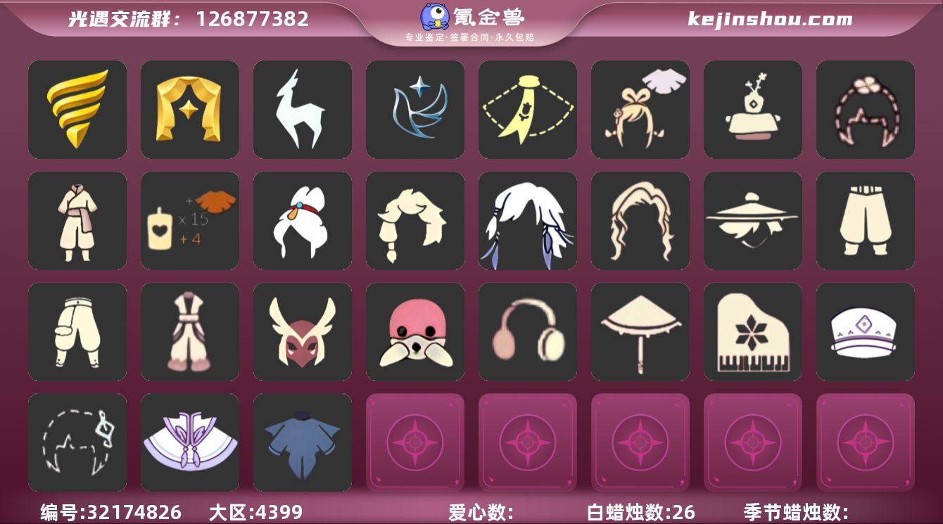 [17451573]VIVO 手机账号 1珍稀物品 4毕业季 3毕业图 26蜡烛 【珍稀物品】白枭(帝企鹅发) 【季节已毕业】青鸟季,潜海季,表演季,九色鹿(九色鹿季) 【完成地图】雨林,霞谷,墓土(暮土) 【礼包】暗彩装扮(彩虹武士裤),绊爱(绊爱斗篷)(绊爱礼包),四叶草(四叶草头饰),创始人(创始人斗篷),围巾(小王子斗篷)(小王子围巾),茶桌(花憩茶桌) 【裤子】飞天裤(柔缎花边连)(九色鹿丝带裤),武士裤,搓澡巾 【面具】黄眉企鹅面具,呼吸面具(潜水面具) 【面饰】青鸟毕业面饰(青鸟面饰),红耳机 【发型】单侧绑发(单边小辫),飞天盘发(九色鹿丸子头),虚荣,归巢毕业发型(五塑彩羽发),若笠(箬笠) 【头饰】平顶帽,蓝色音乐会(蓝色音乐符) 【斗篷】燕尾斗篷,青鸟毕业斗篷(青鸟斗篷),海洋斗 【配饰】雨伞,高音钢琴(白色高脚钢琴)