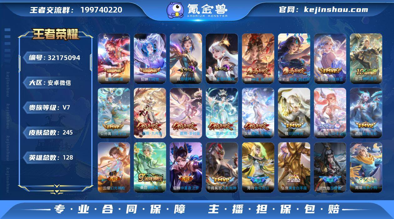 MCK630740 【——3/21可登V】 皮肤数量245 印记总数7 【V7】 【非凡王者】 【暂时不可修改】 万战以上1 荣耀典藏2 星元皮肤2 传说18 史诗64 万战以上:万战朵莉亚; 荣耀典藏:貂蝉_幻阙歌,瑶_拾光映像; 星元皮肤:貂蝉_金色仲夏夜,镜_破晓神光; 传说:海月_金乌负日,貂蝉_神骥·聚万邦,朵莉亚_神骥·鸣幻洲,张良_黄金白羊座,貂蝉_仲夏夜之梦,王昭君_长夜焕生,后羿_神树通天,干将莫邪_久胜战神,镜_炽阳神光,公孙离_云诺千山,澜_愿照九州拓,女娲_愿照千秋盛,云缨_幻光神枪,虞姬_愿照岁时盈,妲己_愿照众生和,桑启_鸣野蒿,西施_游龙清影,朵莉亚_心动手记; 史诗:张良_千筹问战,明世隐_百晓客,小乔_线条小狗,元歌_无心,周瑜_线条小狗,项羽_九幽镇关,妲己_热情桑巴,曹操_幽灵船长,露娜_紫霞仙子,安琪拉_乘龙聚宝船,少司缘-巫礼祀神,雅典娜_冰冠公主,杨玉环_遇见飞天,百里玄策_原初追逐者,莱西奥_光弋星穹,镜_真我赫兹,公孙离_涂山容容,少司缘_涂山红红,西施_织梦人,廉颇_地狱岩魂,瑶_山海碧波行,蔡文姬_舞动绿茵,百相守梦-黄忠,孙尚香_蔷薇恋人,朵莉亚_幻珠鲛人,云缨_赞萌露比,花木兰_水晶猎龙者,周瑜_百相守梦,西施_至美乘鲤谣,兰陵王_暗隐猎兽者,大乔_白蛇,张飞_乱世虎臣,小乔_缤纷独角兽,狂铁_龙之律动,刘禅_鸭鸭历险记,阿珂_化蝶舞,亚瑟_心灵战警,孙膑_茶境仙,铠_曙光守护者,嬴政_摇滚巨星,伽罗_箭羽风息,百里守约_百相守梦,小乔_青蛇,吕布_圣诞狂欢,阿珂_节奏热浪,李元芳_逐浪之夏,孙尚香_水果甜心,蒙犽_顽岩魄,蔡文姬_夏日便利店,不知火舞_魅语,狄仁杰_魔术师,公孙离_无限星赏官,海诺_心动手记,妲己_女仆咖啡,赵云_皇家上将,安琪拉_心灵骇客,澜_赏金猎手,瑶_遇见神鹿,貂蝉_唤灵魅影,西施_诗语江南,狄仁杰_鹰眼统帅,宫本武藏_鬼...