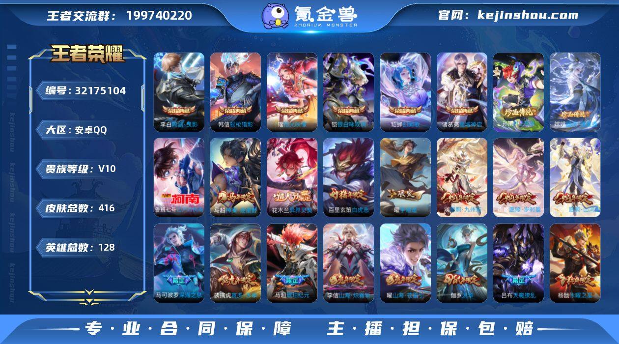 无二次-1万2金标元流之子-安卓Q-V10-最强王者段位-128英雄-416皮肤-6典藏皮肤-3珍品传说-59传说-150史诗HZ263807 【英雄全皮】:孙权全皮,娜可露露全皮,橘右京全皮,苍全皮,苏烈全皮,马超全皮,敖隐全皮,鲁班大师全皮,蒙恬全皮,夏洛特全皮,司空震全皮,戈娅全皮 【荣耀典藏】:李白鸣剑曳影,诸葛亮星域神启,铠银白咏叹调,貂蝉幻阙歌,韩信弑枪猎影,瑶拾光映像 【珍品传说】:嫦娥器灵落星盏,孙策时之奇旅,鲁班七号江户川柯南 【传说皮肤】:马超神骥逐星野,花木兰异界灵契,西施续相思,杨玉环星之鸣奏,司空震愿照山河定,澜愿照九州拓,虞姬愿照岁时盈,裴擒虎祥瑞亨通,桑启鸣野蒿,马超琥珀纪元,艾琳觅芳踪,露娜霜月吟,云缨鹤归松栖,马可波罗妄想实况,公孙离记忆之芯,夏洛特浮生妄,干将莫邪画中仙,项羽无限倾心,孙悟空齐天大圣,曜山海苍雷引,李信山海炽霜斩,吕布怒海麟威,狄仁杰神器狴犴令,不知火舞绯月行,王昭君星穹之声,百里守约碎云,橘右京枫霜尽,娜可露露前尘镜,马可波罗深海之息,后羿无尽星芒,马超无双飞将,裴擒虎寅虎赤拳,鲁班七号寅虎瑞焰,孙尚香异界灵契,貂蝉遇见胡旋,赵云淬星耀世,曜李逍遥 ,周瑜音你心动,李元芳飞鸢探春,诸葛亮时雨天司,镜炽阳神光,虞姬启明星使,孙悟空零号赤焰,关羽武圣,李信一念神魔,刘备时之恋人,伽罗太华,貂蝉猫影幻舞,干将莫邪久胜战神,达摩黄金狮子座,百里玄策白虎志,梦奇胖达荣荣,后羿黄金射手座,杨戬永曜之星,诸葛亮武陵仙君,貂蝉仲夏夜之梦,宫本武藏地狱之眼,吕布天魔缭乱,狄仁杰超时空战士 【限定皮肤】:狄仁杰阴阳师,廉颇寅虎御盾,赵云皇家上将,赵云龙胆,赵云百木心枪,墨子神迹守卫,墨子降魔,妲己时之奇旅,孙尚香蔷薇恋人,孙尚香异界灵契,鲁班七号乒乒小将,鲁班七号寅虎瑞焰,庄周高山流...