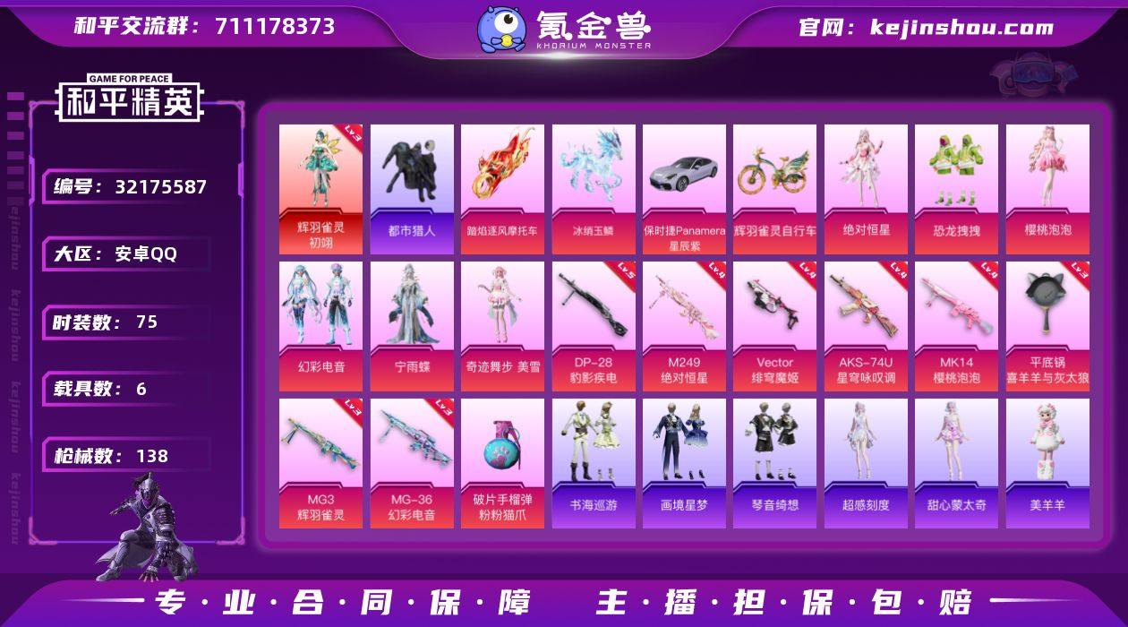 【kyhp995】安卓 手Q-1神装-7粉装-13特效枪-6载具-9粉色飞行器-53496热力值-5王牌印记-75套装-138枪皮 【红色神装等级】:辉羽雀灵-初翊(三级) 【红色角色神装】:辉羽雀灵-初翊 【热门品类】:套装-都市猎人 【粉色套装】:角色-绝对恒星,粉装-恐龙拽拽,角色-樱桃泡泡,粉装-幻彩电音,角色-宁雨蝶,角色-奇迹舞步 美雪,角色-罪夜之冕 【粉色枪皮等级】:AKM-暮色玫影(三级),AUG-罪夜之冕(五级),UMP45-萌骑冒险(三级),Vector-绯穹魔姬(四级),AKS-74U-星穹咏叹调(四级),Mk14-樱桃泡泡(四级),Mk14-福马献瑞(四级),M249-绝对恒星(四级),DP-28-豹影疾电(五级),MG3-辉羽雀灵(三级),MG-36-幻彩电音(三级),平底锅-喜羊羊与灰太狼(三级) 【粉色载具】:保时捷Panamera(星辰紫),踏焰逐风摩托车,僚机-圣域龙宝,冰绡玉鳞,暮色幽蹄,霜月冰狼,辉羽雀灵自行车 【粉色枪皮】:AKM-暮色玫影,AUG-罪夜之冕,UMP45-萌骑冒险,Vector-绯穹魔姬,AKS-74U-星穹咏叹调,Mk14-樱桃泡泡,Mk14-福马献瑞,M249-绝对恒星,DP-28-豹影疾电,MG3-辉羽雀灵,MG-36-幻彩电音,平底锅-喜羊羊与灰太狼,破片手榴弹-粉粉猫爪 【粉色飞行器】:绝对恒星飞行器,炫彩糖果飞行器,雀灵庇佑飞行器,御兔特攻飞行器,终晖之翼飞行器,灵猫魔法师飞行器,飞天猪飞行器,暮色之舞飞行器,冰狼掠影飞行器 【粉色降落伞】:绝对恒星降落伞,恐龙拽拽降落伞,樱桃泡泡降落伞,星穹咏叹调降落伞,辉羽雀灵降落伞,幻彩电音降落伞,冷漠罗丽降落伞,绯穹魔姬降落伞,喜羊羊与灰太狼降落伞,魔童闹海 敖丙降落伞,炫彩糖果降落伞,暮色玫影降落伞,罪夜之冕降落伞,灵驹仙姬降落伞 【稀有套装】:角色-超感刻度,角色-甜心蒙太奇,套装-雪国风尚,套装-炫彩糖果,套装-马上来财,角色-糖霜甜心,角色-蜜桃派对,套装-粉恋花,套装-紫幽梦...