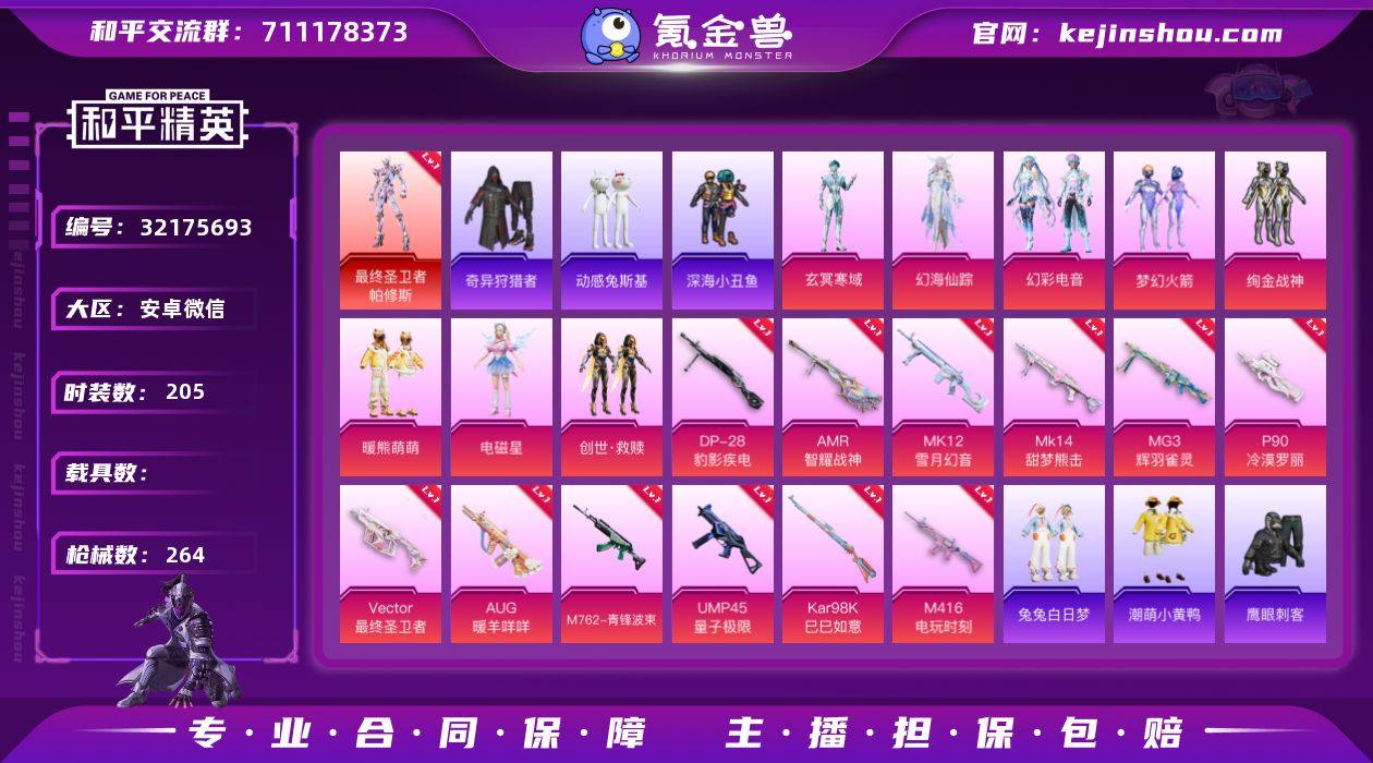 1红装 8粉装 13粉枪 1稀有装备 205套装 264枪皮 47热门 奇异狩猎者 最终圣卫者-帕修斯 梦幻火箭 绚金战神 暖熊萌萌 甜蜜菠萝 滨海厨神 幻羽潜行 虎虎生威吉莉 精神漫游 空投萌叽 极速竞梦 白熊同盟 炫蓝之夏 萌黄之夏 黄色名流 牛气满满 猛禽 破晓战魂 鹤鸣 荣耀 覆海蛟龙 耀粉歌者 潮流炫酷 飞行日记 福星高照 柠萌假日 王牌教练 飞驰魅影 龟仙人 音速流光 果汁能量 冷焰舞者 魔力冰咖 空岛之星 贵族骑装 萌趣咩咩 竞技名士 清新柠檬 娇憨猪猪 深蓝色名流 酒红色名流 战地督导 极乐追光 灼焰舞者 龙的传人 玉兔迎春 森林游猎者 田园牧歌 轻风白浪 湖蓝色名流 光之冒险 雨林探路者 绯格组合 龙腾端午 冰冻风暴 完美偶像 千禧之恋 街头潮人 怒火燎原 蓝彩潮人 绮丽涂鸦 特殊使命 缤纷果语 野性战心 Alan Walker 沙漠毒蛇 格斗先锋 幻世战舞者 人气偶像 龙舌兰冰茶 幻影武者 都市魅力 冰川特警 夏日音浪 热血青春 探宝勇士 创世·救赎 角色-玄冥寒域 角色-电磁星 角色-幻海仙踪 幻彩电音 Vector-最终圣卫者(3级) MG3-辉羽雀灵(3级) S686-生命誓言 GROZA-影袭 S1897-炫彩节奏 GROZA-黑色刀锋 Mini14-耀粉歌者 S1897-飞驰魅影 汤姆逊-异彩先驱 DBS-焰鹰斗篷 S12K-幻世战舞者 DP-28-焰鹰斗篷 M416-红色方程式 汤姆逊-耀粉歌者 S12K-娇憨猪猪 S686-红色方程式 Mini14-筑梦精灵 S12K-破晓战魂 AUG-耀粉歌者 QBZ-飞驰魅影 DBS-甜心亚梦 野牛-乌木金纹 M24-影袭 SPAS-12-田园牧歌 DP-28-甜心宝贝 M249-糯团青竹 Mini14-春暖花开 DP-28-甜心亚梦 MP5K-异彩先驱 AC-VAL-天降萌叽 AC-VAL-甜心亚梦 Mini14-异彩先驱 QBZ-电玩视界 AC-VAL-乌木金纹 P90-筑梦精灵 DP-28-齐天大圣 蜜獾-天降萌叽 蜜獾-娇憨猪猪 Kar98K-炫彩节奏 AKM-灼热熔岩