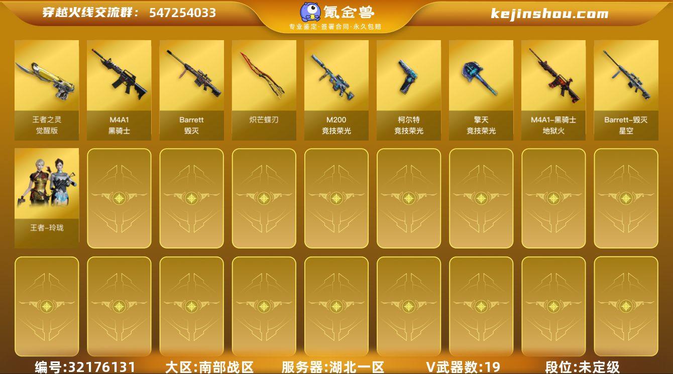 湖北一区-24V-5王者武器数-0炫金武器数 【热门武器】:M200-竞技荣光,炼狱-迷你小钢,M4A1-黑骑士,炽芒蝶刃 【音效卡】:Barrett-毁灭音效卡 【皮肤】:毁灭-星空,黑骑士-地狱火 【角色】:王者玲珑,芳心审判者 【人偶武器】:M4A1-雷神-精英刀锋,炼狱-迷你小钢 【英雄级武器】:M4A1-黑骑士,王者白虎-觉醒版,Barrett-毁灭,M200-竞技荣光,王者之怒-觉醒版,王者之光-觉醒版,王者之决-觉醒版,柯尔特-竞技荣光*3,王者之灵-觉醒版,擎天-竞技荣光*3,炽芒蝶刃,高爆手雷-竞技荣光*3,闪光弹-竞技荣光*3,烟雾弹-竞技荣光*3 【道具】:女皇终结者-魔龙之吻,灵魂忍者,迷雾幽灵,夺命之镰,防化服*2,C4工具钳,手雷包 【特殊枪械】:1黑骑士
