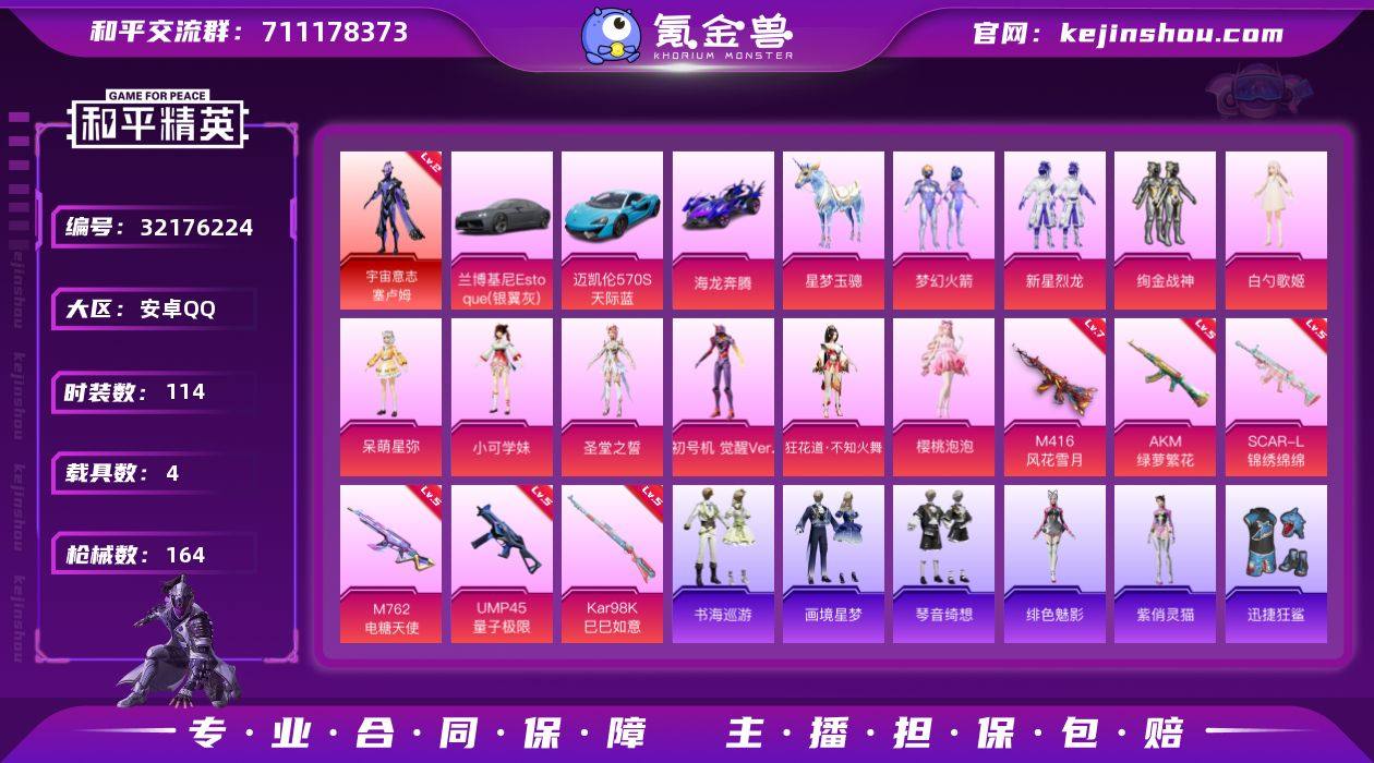 【kyhp1001】安卓 手Q-1神装-10粉装-7特效枪-4载具-2粉色飞行器-55121热力值-5王牌印记-114套装-164枪皮 【红色神装等级】:宇宙意志-塞卢姆(二级) 【红色角色神装】:宇宙意志-塞卢姆 【热门品类】:粉装-梦幻火箭,套装-龟仙人,套装-暗影哥特,角色-8号机 【粉色套装】:粉装-梦幻火箭,粉装-新星烈龙,粉装-绚金战神,角色-白勺歌姬,角色-呆萌星弥,角色-小可学妹,角色-圣堂之誓,角色-初号机 觉醒Ver.,角色-狂花道·不知火舞,角色-樱桃泡泡 【粉色枪皮等级】:AKM-绿萝繁花(五级),SCAR-L-锦绣绵绵(五级),M416-风花雪月(七级),M762-电糖天使(五级),UMP45-量子极限(五级),Kar98K-巳巳如意(五级),Mk14-福马献瑞(五级) 【粉色载具】:兰博基尼Estoque(银翼灰),迈凯伦570S(天际蓝),海龙奔腾,星梦玉骢 【粉色枪皮】:AKM-绿萝繁花,SCAR-L-锦绣绵绵,M416-风花雪月,M762-电糖天使,UMP45-量子极限,Kar98K-巳巳如意,Mk14-福马献瑞 【粉色飞行器】:深渊漩涡飞行器,极意拳锋飞行器 【粉色降落伞】:绝对恒星降落伞,未来歌姬降落伞,精灵梦叶罗丽降落伞,星梦奇缘降落伞,初号机 觉醒Ver.降落伞,月影灵韵降落伞,异瞳寒姬降落伞,虎痴许褚降落伞 【稀有套装】:套装-龟仙人,套装-巳巳如意,套装-雪国风尚,角色-奈斯,角色-罗莉,套装-马上有钱,套装-萝兰蝴蝶,套装-火种守卫者,套装-燕燕于飞,套装-鱼渊荷华,角色-猎影月神,角色-绯色魅影,角色-紫俏灵猫,套装-书海巡游,套装-画境星梦,套装-琴音绮想,套装-雨过天青,套装-红釉青花 【稀有枪皮】:AKM-彩虹符号,AKM-破晓战魂,AKM-龙的传人,M16A4-幻世战舞者,SCAR-L-玉兔迎春,M416-糯团青竹,M416-蓝色火焰,GROZA-彩虹符号,GROZA-田园牧歌,GROZA-晶梦幻蝶,AUG-天降萌叽,AUG-耀粉歌者,QBZ-彩虹符号,M762-天降萌叽,M762-彩虹...