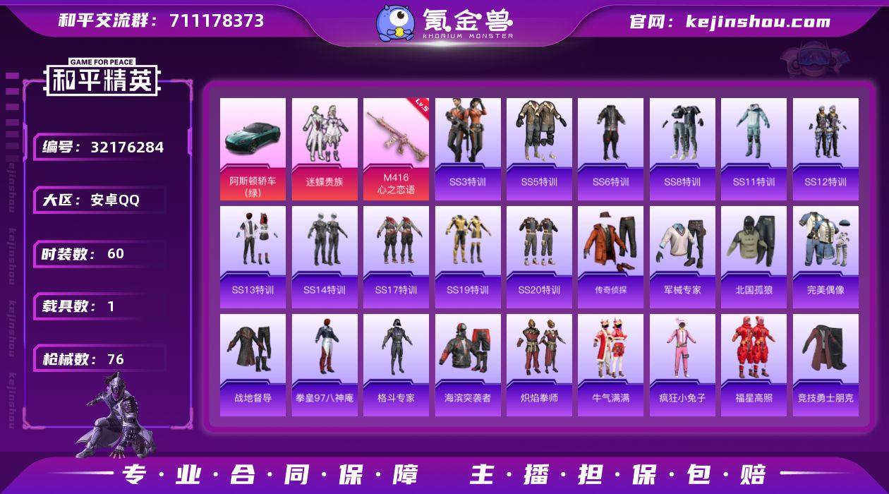 安卓 【小号 M416-心之恋语(五级)/阿斯顿马丁DBS(绿)】手Q-1粉装-2特效枪-1载具-0粉色飞行器-25342热力值-1王牌印记-60套装-76枪皮 【粉色套装】:粉装-迷蝶贵族 【粉色枪皮等级】:M416-心之恋语(五级),ACE32-萌骑漫游(四级) 【粉色载具】:阿斯顿马丁DBS(绿) 【粉色枪皮】:M416-心之恋语,ACE32-萌骑漫游 【粉色降落伞】:四圣焕新降落伞,荧光虫舞降落伞,洛神天依降落伞,星穹咏叹调降落伞,镜花水月降落伞 【稀有套装】:套装-雨过天青,套装-红釉青花 【稀有枪皮】:AKM-夜灯,AKM-破晓战魂,AKM-虎虎生威,AKM-龙的传人,M16A4-红色方程式,GROZA-治愈之星,GROZA-马卡龙,AUG-耀粉歌者,QBZ-原初圣火,QBZ-洛神天依,QBZ-潮汐统领,M762-拳皇97,M762-牛气冲天,M762-镭射皇者,Mk47-洛神天依,UZI-炫彩节奏,UMP45-生命誓言,Vector-彩虹符号,Vector-治愈之星,Vector-香水柠檬,汤姆逊-环太平洋,Kar98K-红色方程式,M24-治愈之星,M24-冰封烈焰,VSS-镭射皇者,Mini14-原初圣火,Mini14-炫彩节奏,Mini14-耀粉歌者,Mk14-治愈之星,SLR-四圣焕新,S686-冰封烈焰,S1897-镭射皇者,M249-四圣焕新,M249-拳皇97,M249-镭射皇者,DP-28-原初圣火,DP-28-锦绣火鲤,P92-拳皇97,P1911-冰封烈焰,P18C-原初圣火 【其他套装】:套装-SS3特训,套装-SS5特训,套装-SS6特训,套装-SS8特训,套装-SS11特训,套装-SS12特训,套装-SS13特训,套装-SS14特训,套装-SS17特训,套装-SS19特训,套装-SS20特训,套装-传奇侦探,套装-军械专家,套装-北国孤狼,套装-完美偶像,套装-战地督导,套装-拳皇97八神庵,套装-格斗专家,套装-海滨突袭者,套装-炽焰拳师,套装-牛气满满,套装-疯狂小兔子,套装-福星高照,套装-竞技勇士朋克,套装-竞技名士,套装-缤纷果语,套装-荣耀,套装-跃动心情,套装-长空猛禽,...