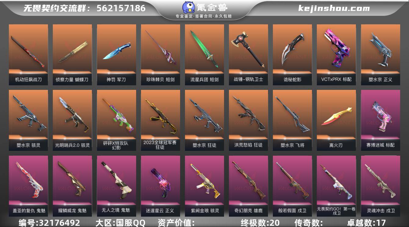 【套装】:离火刃套装,塑水宗套装,离火刃套装,耀鳞威龙套装,无畏启程套装 【英雄】:幻棱,炼狱,维斯,暮蝶,钛狐,壹决,铁臂,捷风,雷兹,幽影,不死鸟,贤者,猎枭,蝰蛇,零,芮娜,奇乐,尚勃勒,霓虹,斯凯,夜露,星礈,K/O,海神,盖可,黑梦,钢锁 【近战武器】:近战武器-侦察力量 蝴蝶刀,近战武器-离火刃,近战武器-黑波之刃,近战武器-落英飞旋,近战武器-威龙之刃,近战武器-珍珠棘贝 短剑,近战武器-流星兵团 短剑,近战武器-钢轨卫士 战锤,近战武器-机动狂飙 战刀,近战武器-神罚 军刀,近战武器-诡秘蛇影 军刀 【狂徒】:狂徒-2023全球冠军赛,狂徒-洪荒怒焰,狂徒-塑水宗,狂徒-盖亚的复仇,狂徒-海洋之星,狂徒-起源,狂徒-耀鳞威龙,狂徒-紫阙金琅,狂徒-钢轨卫士,狂徒-弧光异彩,狂徒-流星兵团,狂徒-诡秘蛇影 【幻影】:幻影-砰砰X特攻队,幻影-般若假面,幻影-合金战车,幻影-珍珠棘贝,幻影-神圣领域,幻影-战术小伙伴,幻影-末日之翼 【戍卫】:戍卫-般若假面,戍卫-灵魂冲击,戍卫-无畏契约GO!第一卷,戍卫-钢轨卫士,戍卫-珍珠棘贝,戍卫-彩梦之城,戍卫-花漾粉红,戍卫-战术熊与伙伴们,戍卫-折光棱晶 【獠犬】:獠犬-复古浪潮,獠犬-数码咒术,獠犬-战术小伙伴 【冥驹】:冥驹-无垠星环,冥驹-复古浪潮,冥驹-花漾粉红 【飞将】:飞将-塑水宗,飞将-合金战车,飞将-光导纤维,飞将-战术熊与伙伴们,飞将-末日之翼 【莽侠】:莽侠-诡秘蛇影,莽侠-深海水族,莽侠-纤云弄巧,莽侠-月球哨兵 【战神】:战神-神圣领域,战神-深海水族,战神-数码咒术 【奥丁】:奥丁-流星兵团,奥丁-神罚,奥丁-信手涂鸦,奥丁-炫彩澎湃,奥丁-战术小伙伴,奥丁-末日之翼 【判官】:判官-诡秘蛇影,判官-数码咒术 【雄鹿】:雄鹿-奇幻朋克,雄鹿-彩梦之城,雄鹿-复古浪潮,雄鹿-月球哨兵 【骇灵...