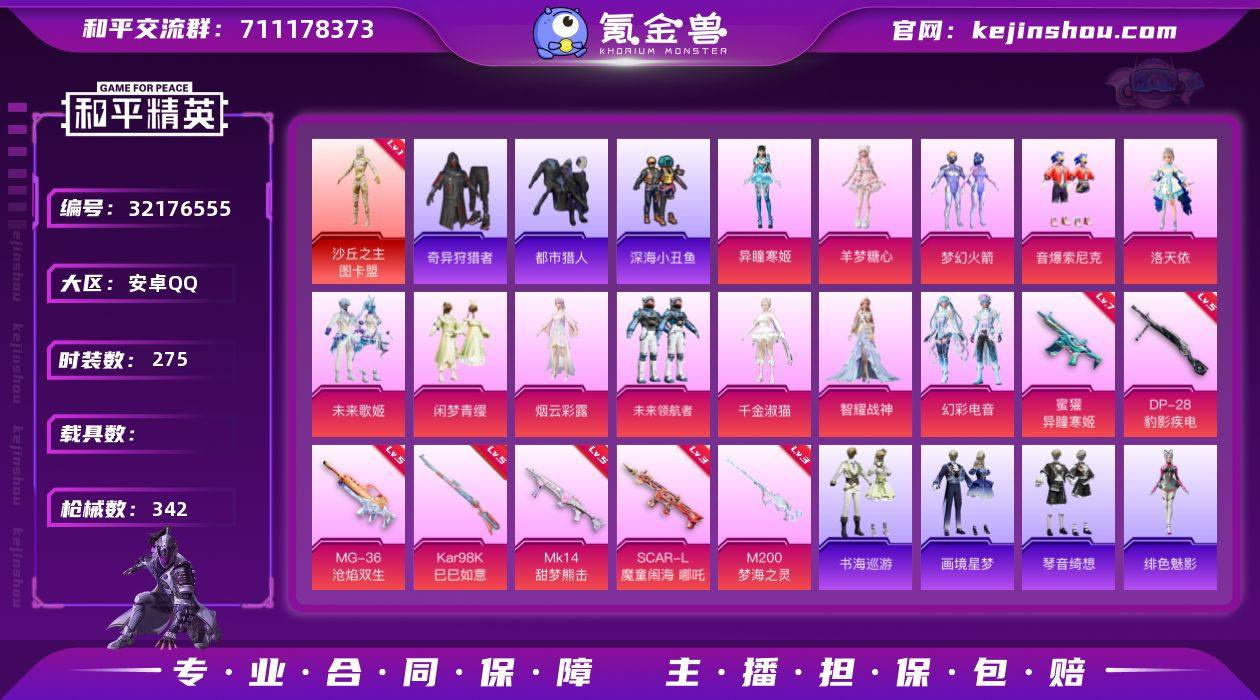安卓 【神装号 沙丘之主-图卡盟(一级)/梦幻火箭/都市猎人/深海小丑鱼/奇异狩猎者/暗影哥特/8号机/洛天依/SCAR-L-魔童闹海 哪吒(三级)/】手Q-1神装-12粉装-9特效枪-0载具-14粉色飞行器-117748热力值-5王牌印记-275套装-342枪皮 【红色神装等级】:沙丘之主-图卡盟(一级) 【红色角色神装】:沙丘之主-图卡盟 【热门品类】:粉装-梦幻火箭,粉装-音爆索尼克,套装-浪漫天命,套装-都市猎人,套装-深海小丑鱼,套装-小丑鱼,套装-奇异狩猎者,角色-军刀雅典娜,套装-忍者信条,套装-龟仙人,套装-暗影哥特,角色-8号机,角色-Mark.06 【粉色套装】:粉装-梦幻火箭,角色-洛天依,粉装-音爆索尼克,粉装-未来歌姬,粉装-闲梦青缨,角色-烟云彩露,粉装-未来领航者,角色-千金淑猫,角色-智耀战神,粉装-幻彩电音,角色-羊梦糖心,角色-异瞳寒姬 【粉色枪皮等级】:SCAR-L-魔童闹海 哪吒(三级),蜜獾-异瞳寒姬(七级),ACE32-萌骑漫游(二级),AKS-74U-森灵之息(五级),Kar98K-巳巳如意(五级),Mk14-甜梦熊击(五级),M200-梦海之灵(三级),DP-28-豹影疾电(五级),MG-36-沧焰双生(五级) 【粉色枪皮】:SCAR-L-魔童闹海 哪吒,蜜獾-异瞳寒姬,ACE32-萌骑漫游,AKS-74U-森灵之息,Kar98K-巳巳如意,Mk14-甜梦熊击,M200-梦海之灵,DP-28-豹影疾电,MG-36-沧焰双生 【粉色飞行器】:香车宝马飞行器,炫彩糖果飞行器,太空嘟嘟飞行器,鎏金朋克飞行器,曦光华影飞行器,凤舞九天飞行器,月下星之子飞行器,圣域金龙飞行器,终晖之翼飞行器,智趣喵喵飞行器,灵珠游龙飞行器,暮色之舞飞行器 【粉色降落伞】:极限特训降落伞,幻影战神降落伞,梦幻火箭降落伞,星之彼岸降落伞,烈焰拳霸降落伞,暗夜玫瑰降落伞,洛神天依降落伞,垂柳戏鸭降落伞,暗夜鎏金降落伞,音爆索尼克降落伞,未来歌姬降落伞,拂晓神骑降落伞,闲梦青缨降...