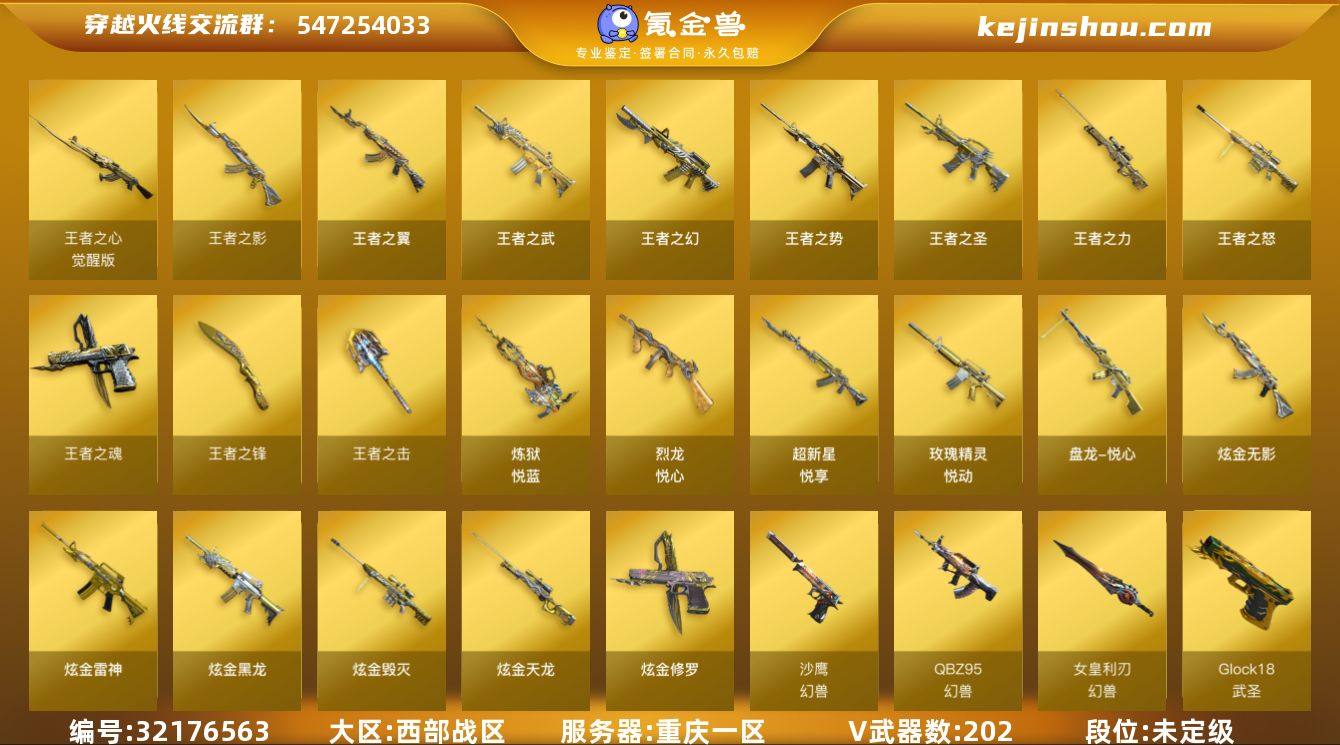 重庆一区-218V-24王者武器数-8炫金武器数 【热门武器】:QBZ03-金色蔷薇*6,M200-幻神,金色小号,C.A.T,M4A1-黑骑士*4,汤姆逊-烈龙*7,RPK-盘龙*6,加特林-炼狱*7,斯泰尔-蝴蝶,USP-雷暴,沙鹰-修罗*3,高爆手雷-幻兽*5 【王者炫金武器】:王者之圣,超新星-悦享*2,王者之幻,王者之翼,王者之势*2,王者之武,玫瑰精灵-悦动,王者之影,王者之怒,王者之力,盘龙-悦心,炼狱-悦蓝*2,烈龙-悦心,王者之魂,王者之击,王者之锋*2,炫金骑士,炫金无影,炫金黑龙,炫金雷神,炫金武士,炫金毁灭,炫金天龙,炫金修罗 【音效卡】:Barrett-毁灭音效卡,Barrett-碧霄极光音效卡,炼狱-百战金芒-庆典舞曲音效卡 【皮肤】:幻神-荣耀世冠EP 皮肤,裁决-星际旅行 皮肤,雷神-暗月,雷神-星空,M4A1-再燃火线,雷神-神秘按键 皮肤,雷神-蓝风铃 皮肤,毁灭耀金皮肤,毁灭-星空,毁灭-英雄计划 皮肤,黑龙-暗月*2,黑骑士-暗月,无影-能量核心,死神-秘银,天龙-秘银*2,极光-能量核心,修罗-能量核心,修罗-星空,修罗-百战金芒 皮肤,屠龙-春桃 皮肤,轻型军用手斧-再燃火线,擎天-秘银 【角色】:零,葵,樱,瞳,蝴蝶,魅影,炫,春,审判者,零·纪元,王者-零,王者之瞳,王者复仇,堕落女神,狐影,葵-阿尔法武装,幻面灵狐,空,暗夜-X,初恋灵狐,娟娟,兰-海滩派对,兰-新年限定,零-水下丽影,灵狐者-X,灵狐者-黄金海岸,蜀雪,铁骑荣耀,铁扇公主-暗灵,新灵狐者,雪莉杨-摸金校尉,影武者-X 【人偶武器】:天龙-曼陀罗,火麒麟-灵狐,山海之灵,斯泰尔-蝴蝶,USP-铃狮送福,AWM-灵狐-15周年嘉年华,COP-旗袍*2,C.A.T,M4A1-刀锋 【暴走生化】:超级对讲机 【挑战大师】:激光毁灭者III-白马银枪,激光毁灭者III,阐释者III 【英雄级武器】:M4A1-千变*2,AK47-火麒麟,AK47-麒麟,M4A1-黑龙*3,M4A1-雷...