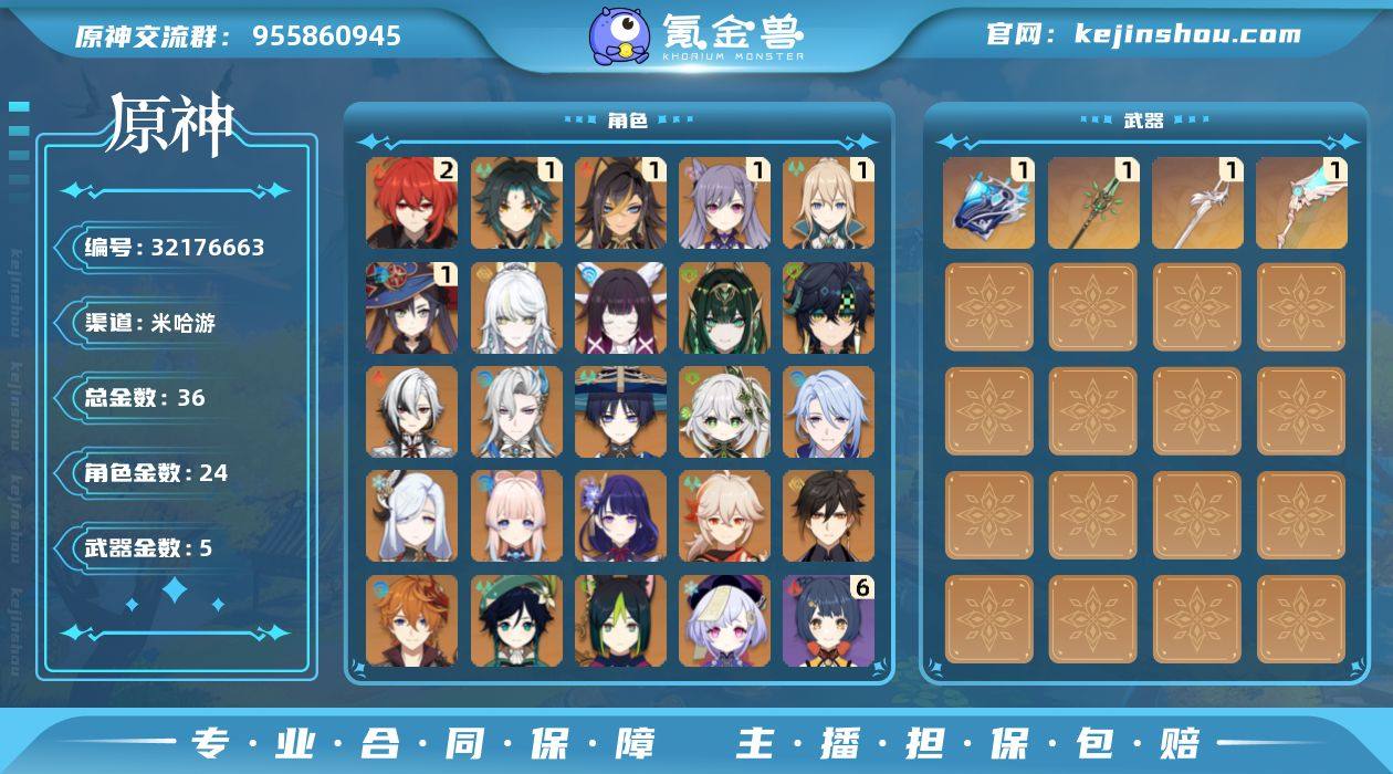 邮箱: 送网易邮箱 总黄数: 36 冒险等级: 60 2命金色角色: 二命迪卢克 1命金色角色: 一命刻晴,一命莫娜,一命琴,一命魈,一命迪希雅 0命金色角色: 温迪,枫原万叶,七七,达达利亚,钟离,雷电将军,珊瑚宫心海,申鹤,神里绫人,提纳里,纳西妲,流浪者,那维莱特,阿蕾奇诺,基尼奇,奈芙尔,哥伦比娅,兹白 拥有武器: 天空之翼,和璞鸢,风鹰剑,万世流涌大典 1精武器: 天空之翼,和璞鸢,风鹰剑,万世流涌大典
