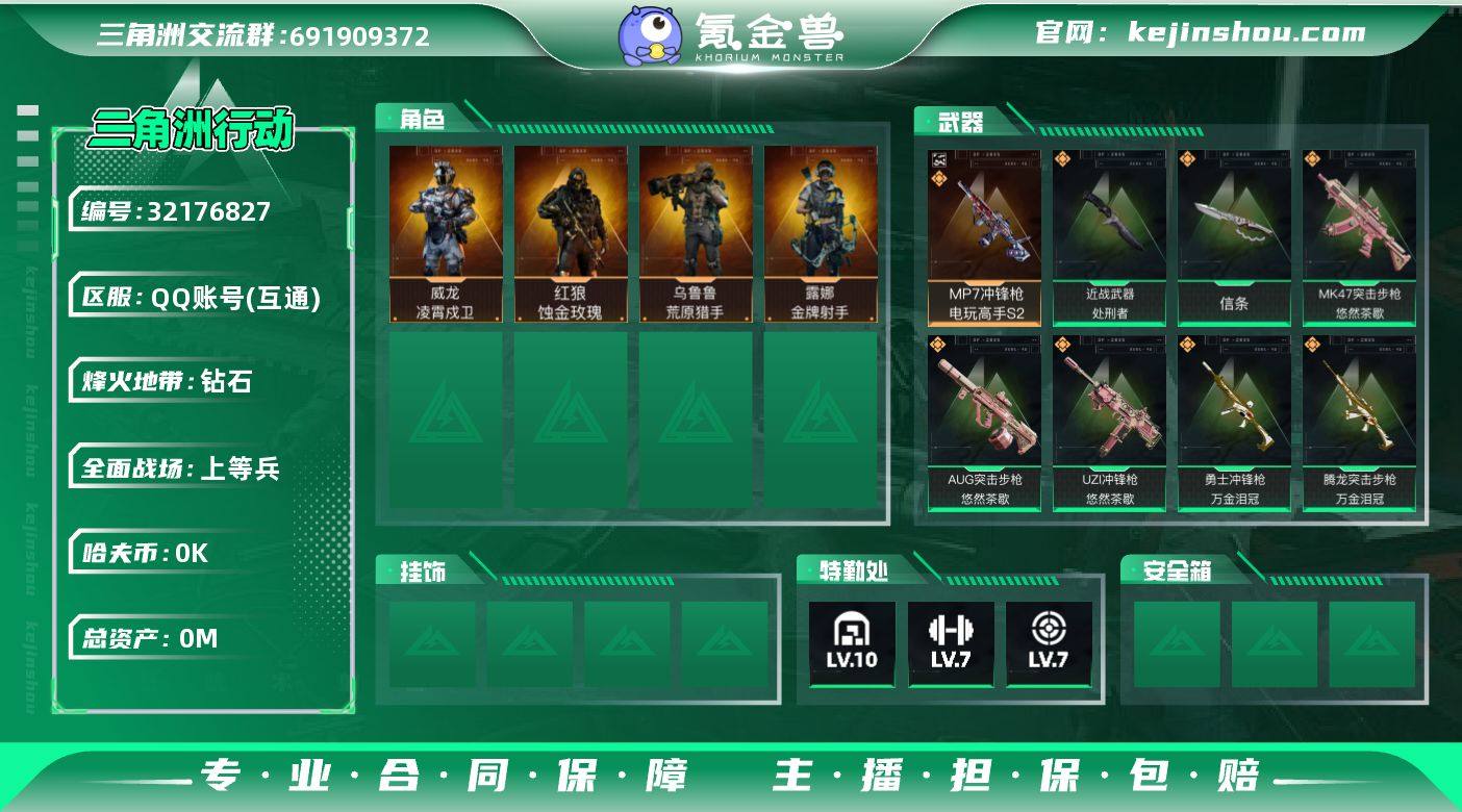 tx1475 总资产404M 烽火等级60级 MP7-电玩高手S2(优品A) 红狼蚀金玫瑰捆绑包 威龙凌霄戍卫捆绑包 信条捆绑包 处刑者单刀皮 万金泪冠捆绑包 缄花捆绑包 悠然茶歇捆绑包 特勤处满级(潜水2) 部门满级 收藏室多大红(49个) S8赛季3x3箱子 S7S8赛季通行证 露娜-金牌射手 87发AWM子弹 400三角卷 仓库多大红 1M纯币