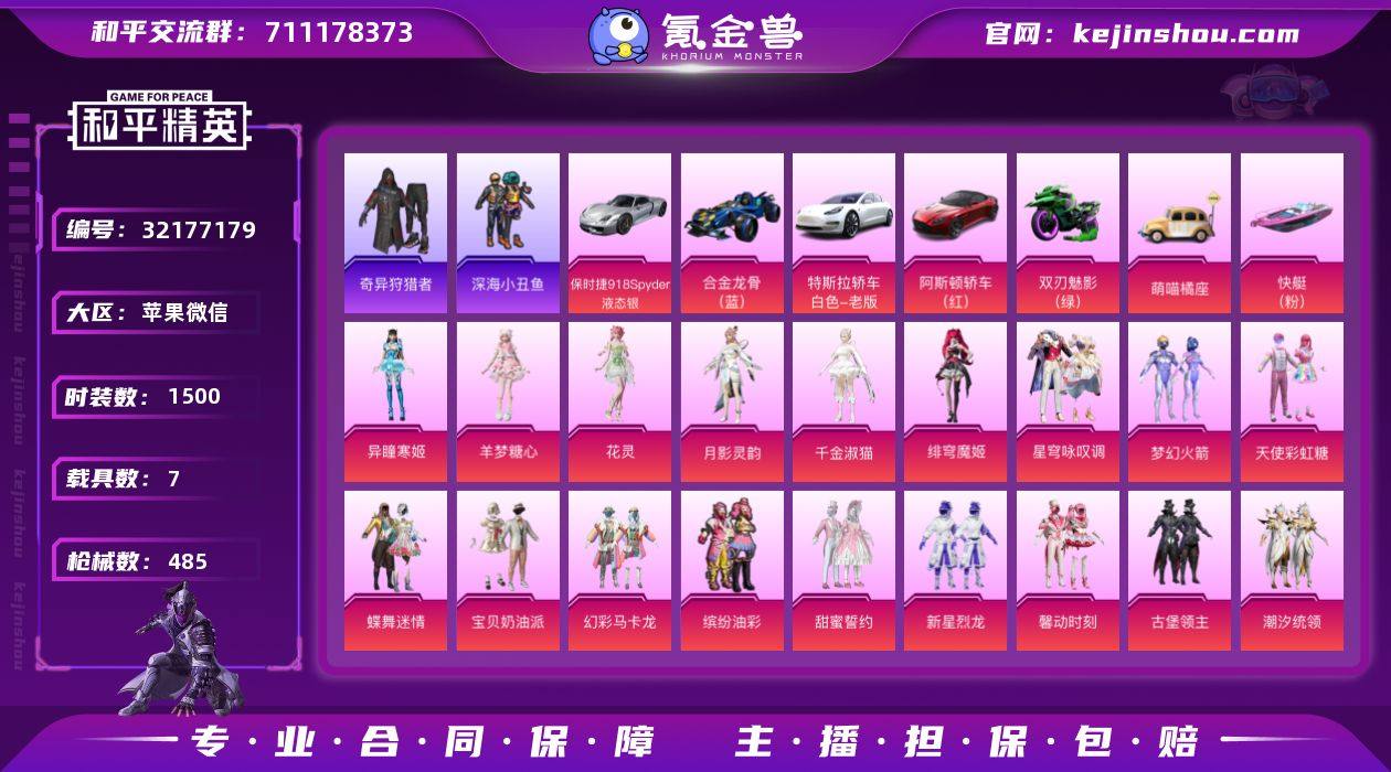 DB4391-果V-可改实名可转区-32王牌印记战神女号-36粉13枪7载具1僚机-梦幻火箭-缤纷油彩-千金淑猫-第五大道-羊梦糖心-巡查衣-螳螂副套-M4心之恋语7级-DP28千金淑猫7级-Mk14盛世惊鸿3级-AK炫紫旋律7级-保时捷918-特斯拉Model 3-合金龙骨-蔚蓝之翼 苹果微信-32王牌印记-有战神框-36粉装-13特效枪-7载具-热力值-411套装-485枪皮-5卓越印记-2传奇印记 【36粉装】套装-狩月元帅,角色-霁蓝缠春,角色-羊梦糖心,套装-极致幻想,套装-潮汐统领,角色-美琪,套装-蝶舞迷情,套装-梦幻火箭,套装-甜蜜誓约,套装-飒粉甜心,角色-异瞳寒姬,套装-绿野柔风,套装-甜梦冰蝶,套装-馨动时刻,套装-天之羽翼,套装-古堡领主,套装-新星烈龙,套装-蝶舞蔷薇,套装-宝贝奶油派,套装-金丰海韵,套装-星穹咏叹调,套装-葫芦兄弟,角色-绯穹魔姬,角色-月影灵韵,角色-美雪,套装-幻彩马卡龙,套装-琉璃脉冲,套装-第五大道,套装-枪炮玫瑰,套装-缤纷油彩,套装-天使彩虹糖,角色-千金淑猫,套装-蜜桃特工,角色-花灵,套装-华贵君王,套装-俏皮狐尾 【13特效枪】DP-28-豹影疾电/5级,UZI-筑梦精灵/7级,MG-36-沧焰双生/5级,M416-心之恋语/7级,DP-28-千金淑猫/7级,Mk14-福马献瑞/5级,Mk14-盛世惊鸿/3级,蜜獾-异瞳寒姬/5级,Kar98K-巳巳如意/5级,UMP45-萌骑冒险/2级,AKM-炫紫旋律/7级,平底锅-喜羊羊与灰太狼/6级,AKS-74U-森灵之息/5级 【10稀有紫装】Mark.06,8号机,巡查衣,奇异狩猎者,深海小丑鱼,浪漫天命,雪山精英,浪漫波比,迅捷狂鲨,龟仙人 【7稀有载具】保时捷918 Spyder(液态银),特斯拉Model 3(珍珠白),阿斯顿·马丁DBS(红),萌喵橘座,合金龙骨(蓝),双人摩托-双刃魅影(绿),快艇-塞莎KL27(霓虹粉)/1级 【1僚机】空客H135-蔚蓝之翼 【411稀有时装】梦幻火箭,绝对防御上衣,宝贝奶油派,天使彩虹糖,缤纷油彩,新星烈龙,蝶舞迷情,第五大道,星穹咏叹调,花灵,绯穹魔姬,羊梦糖心,...